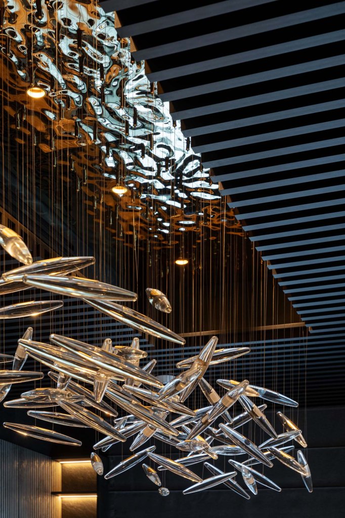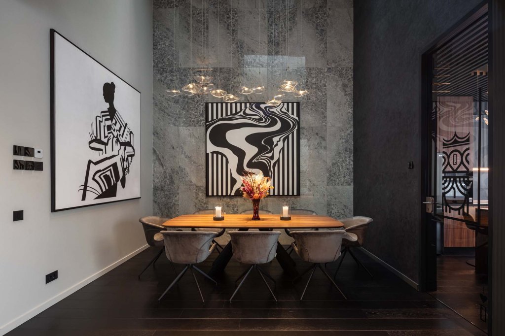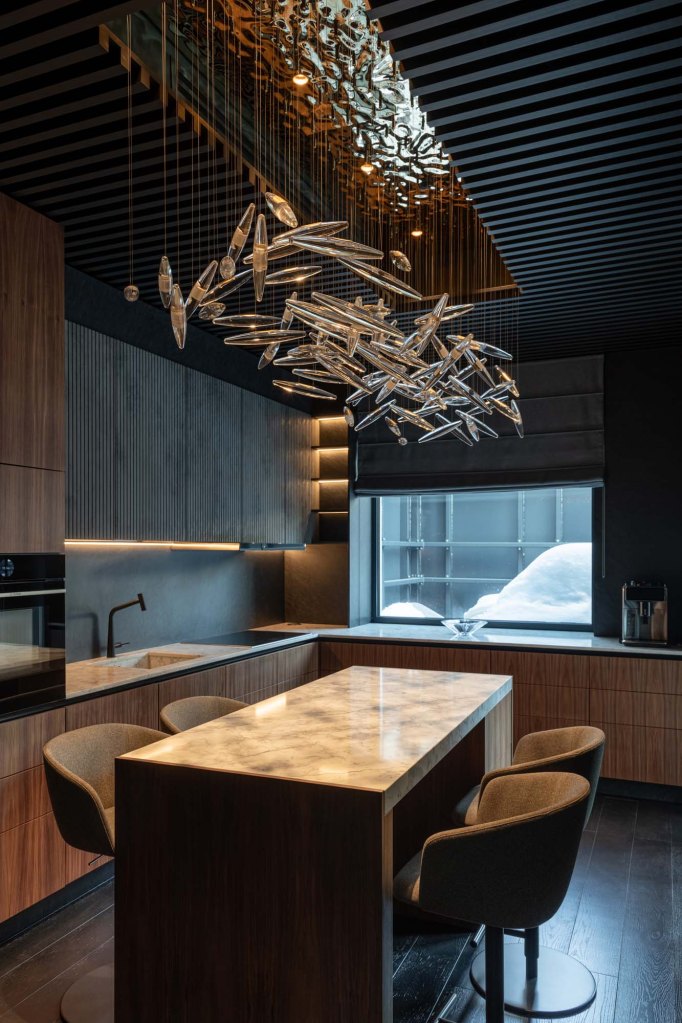 În zona de dining, peretele înalt ce ajunge până la luminator este acoperit cu ceramică inspirată din structurile cristaline, iar corpurile de iluminat creează un joc subtil de umbre și reflecții. Bucătăria se centrează în jurul unei insule impunătoare, deasupra căreia un „stol” de fusuri luminate plutește ca un element artistic în sine.