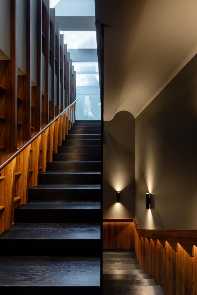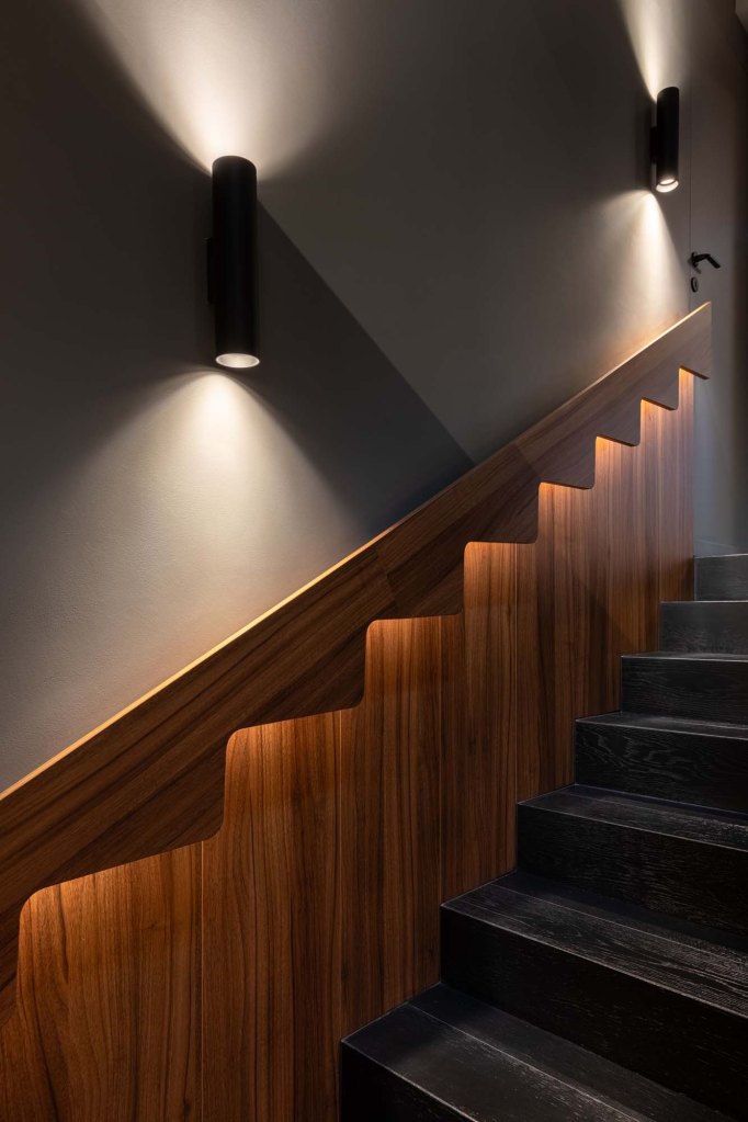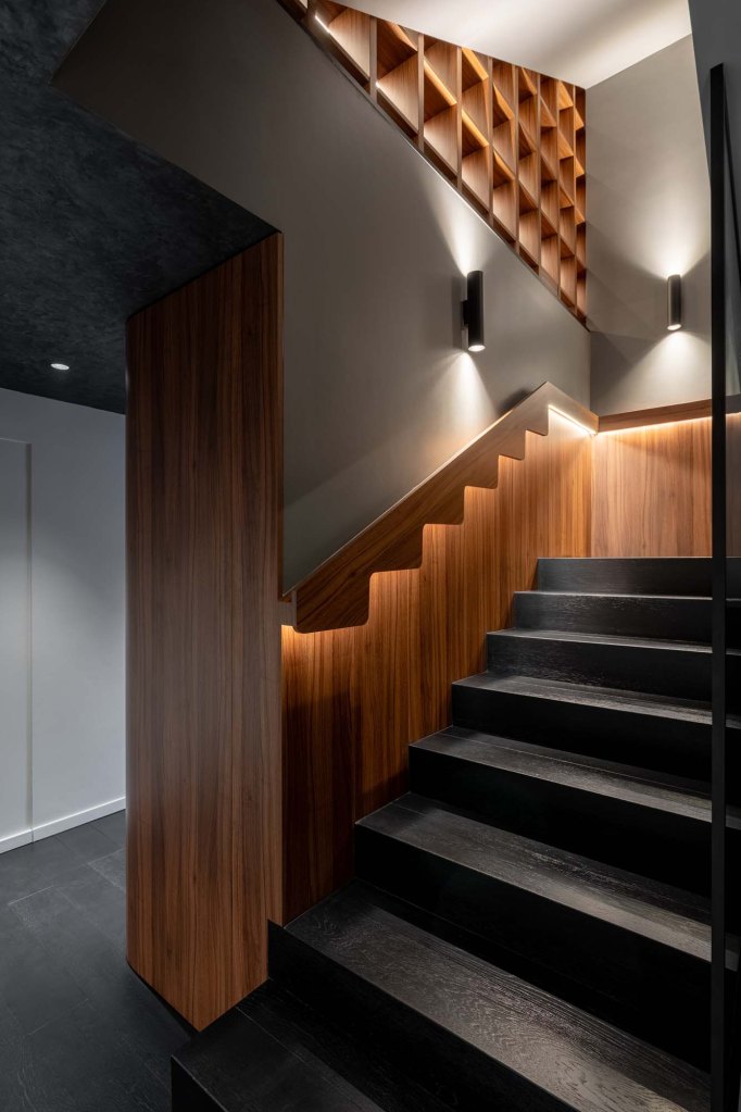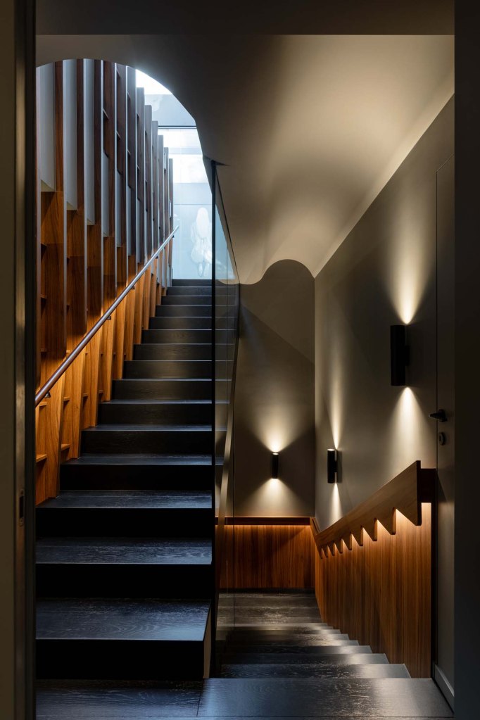 Întregul proiect s-a conturat în jurul unui nucleu arhitectural impunător: o scară interioară spectaculoasă. Jocul dintre luminile poziționate strategic și materialele alese fac din această scară elementul central, definitoriu pentru întreaga locuință. „Interesant a fost faptul că această scară diferă ca geometrie a rampelor de la un etaj la altul, dezvoltându-se ca un ansamblu de trei scări total diferite și suprapuse. Prezența calcanelor pe cele două laturi lungi ale clădirii a impus utilizarea unor luminatoare, astfel relația interior-exterior este foarte puternică”, explică arhitectul Mihail Neagu, care a lucrat la proiect împreună cu Tudor Corici, Tencariu Sergiu și Anca Dumitrache.
