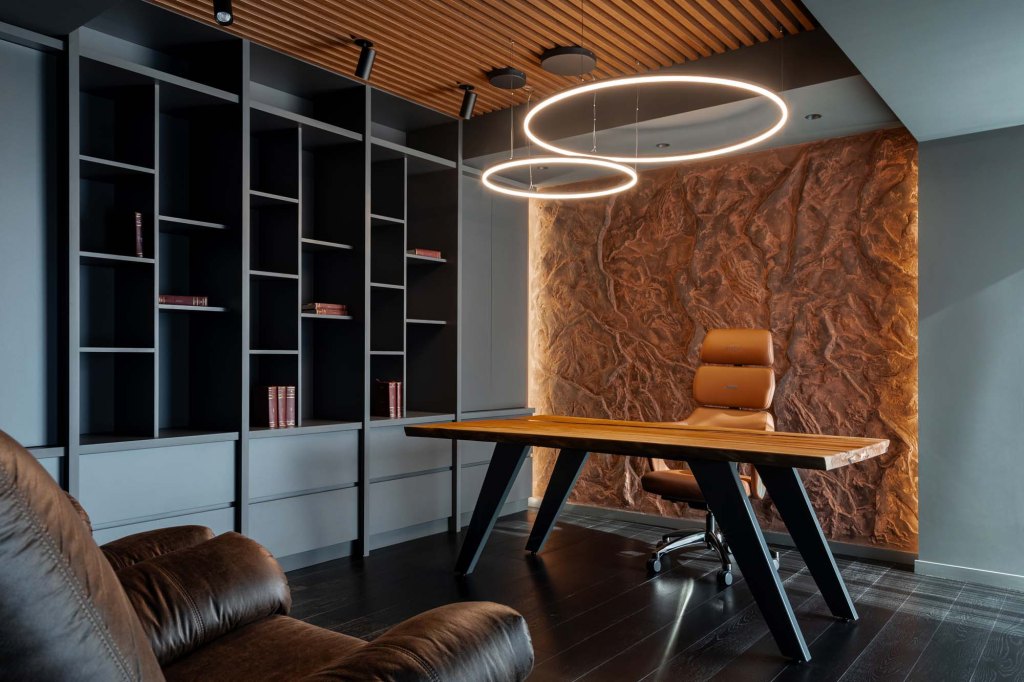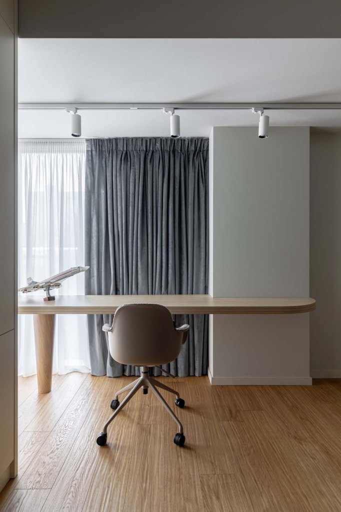 Zona de birou este elegantă și funcțională, cu un blat curbat din lemn, un scaun ergonomic și iluminare direcționată. Per total, designul este unul modern, minimalist și elegant, cu o paletă cromatică neutră predominată de gri, lemn natural și alb.