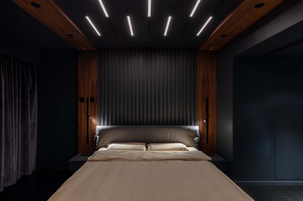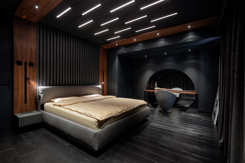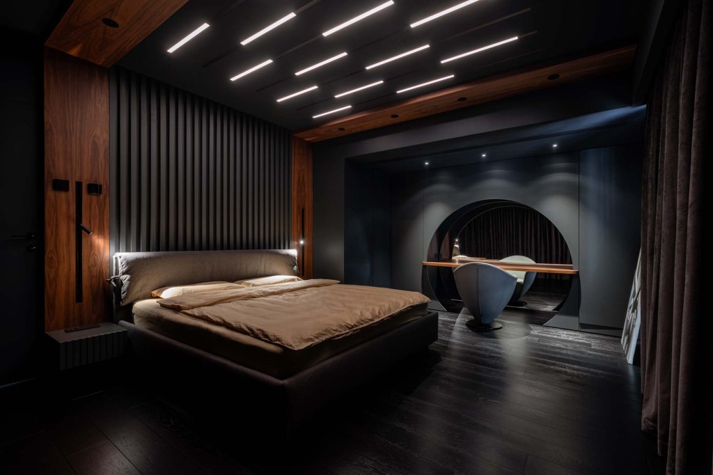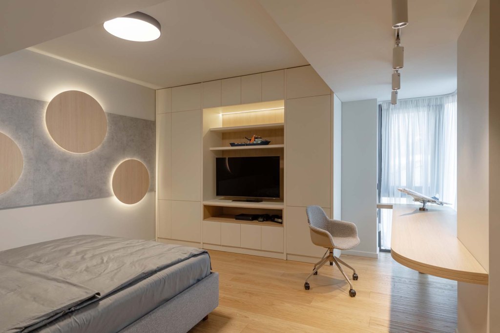 La primul etaj, dormitoarele copiilor sunt singurele spații unde proprietarul a permis o deschidere mai mare către lumină și culori mai blânde, în contrast cu restul casei. De exemplu, în primul dormitor al copiilor, pereții sunt decorați cu panouri din lemn deschis și finisaje de beton. Iluminarea LED în jurul cercurilor decorative adaugă o atmosferă relaxantă și futuristă. Patul este tapițat în material textil gri, cu un aspect confortabil și modern. Mobilierul este integrat în pereți, maximizând spațiul și păstrând un aspect ordonat.