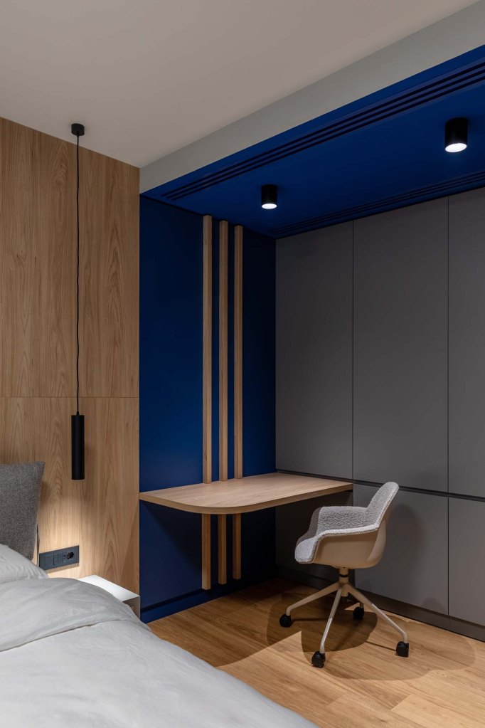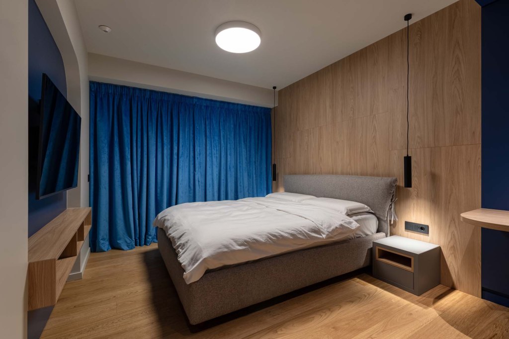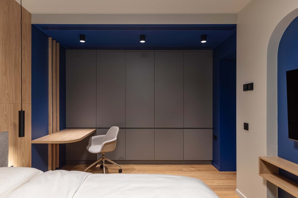 Pentru al doilea dormitor de la primul etaj, echipa a folosit nuanțe ceva mai îndrăznețe. Zona unde este montat televizorul are un perete vopsit în albastru închis, ceea ce adaugă un plus de profunzime camerei.