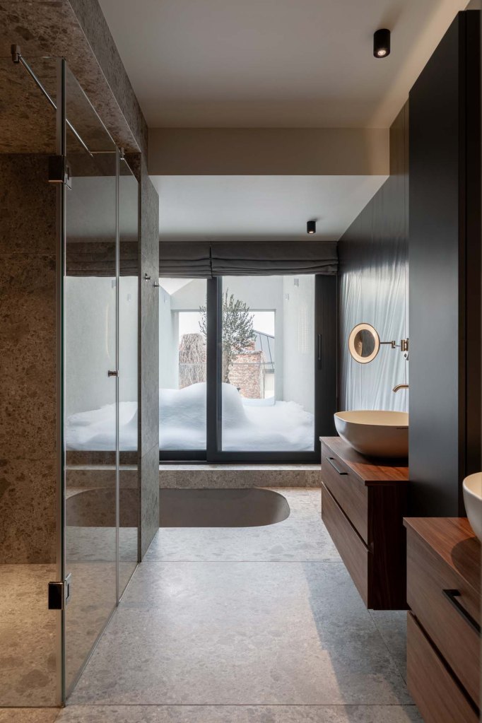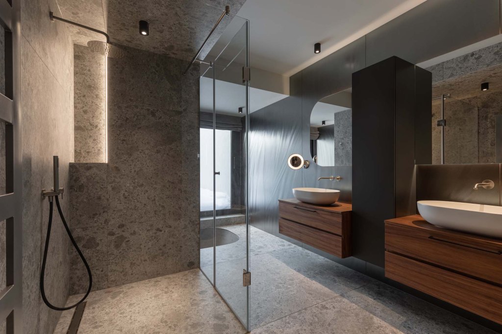 Baia matrimonială îmbină texturile de piatră cu accente de lumină subtil plasate, sugerând ideea unui sanctuar personal, unde timpul pare suspendat.