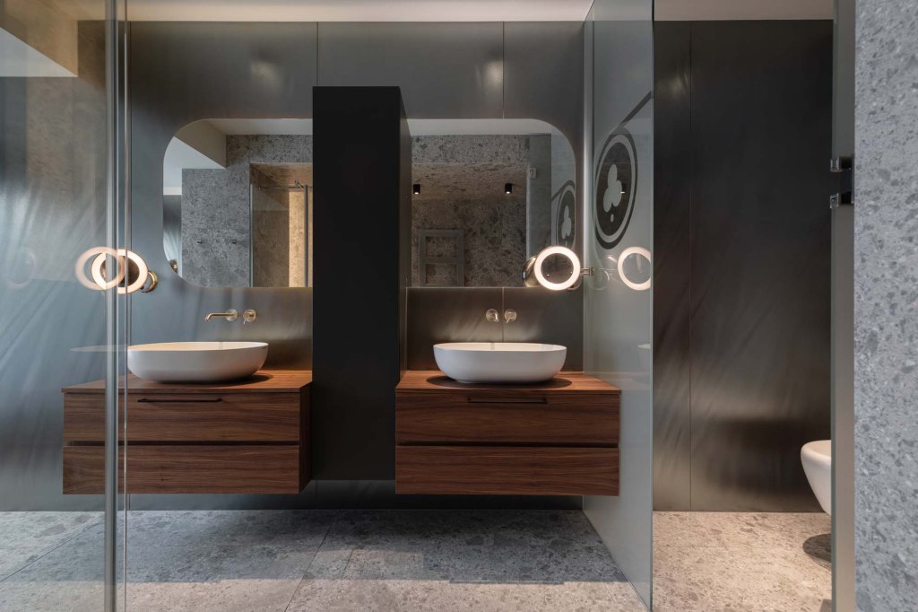 Baia de la parter este un spațiu conceptual, gândit ca un loc „din spatele cortinei”. Plăcile ceramice cu falduri și lavoarul sculptural transformă spațiul într-unul teatral.