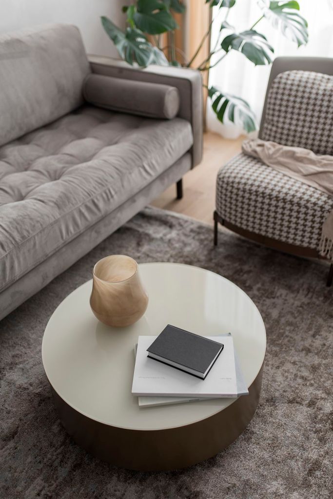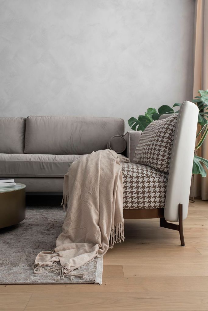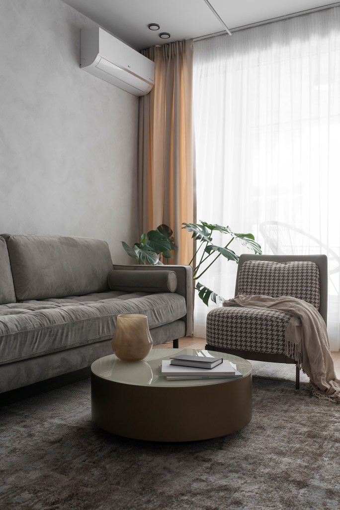 Livingul este amenajat în armonie cromatică cu locul de luat masa, pentru a asigura unitatea decorului. O canapea, un fotoliu și o măsuță în tonuri de bej creează o zonă de relaxare caldă și odihnitoare. Vizavi de living și dining e un dulap, ale cărui fronturi canelate sunt inspirate din arhitectura Art Deco a complexului rezidențial. Prin această alegere, s-a dorit continuarea la interior a poveștii spuse la exterior.