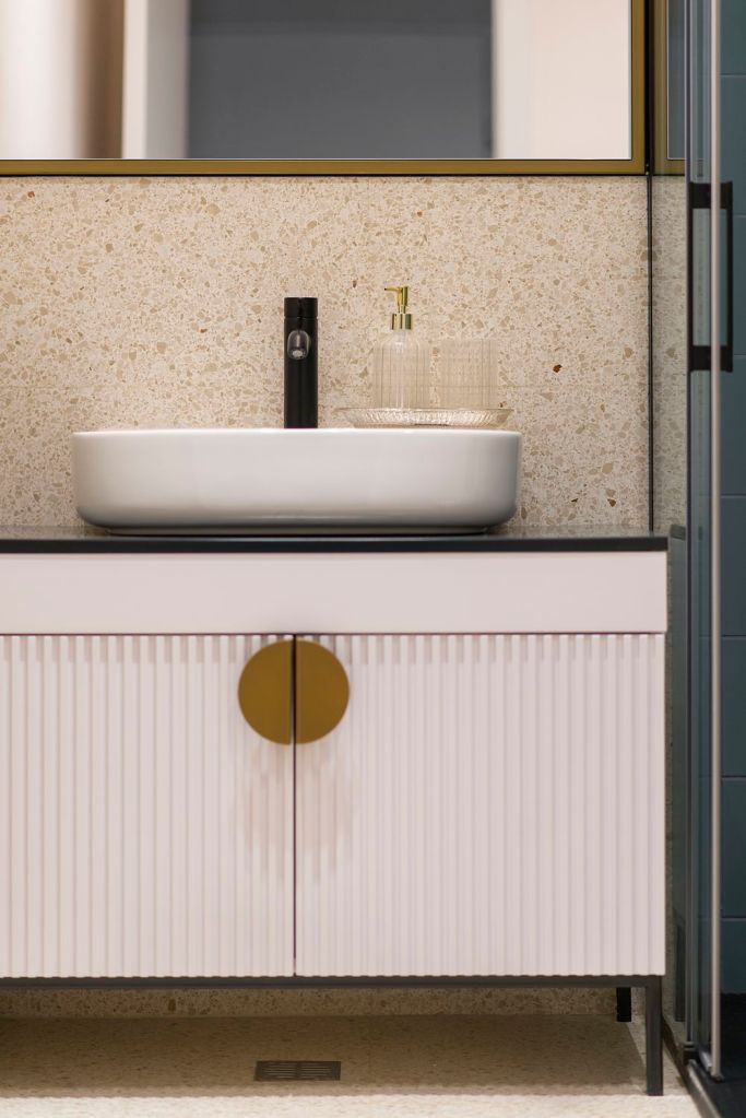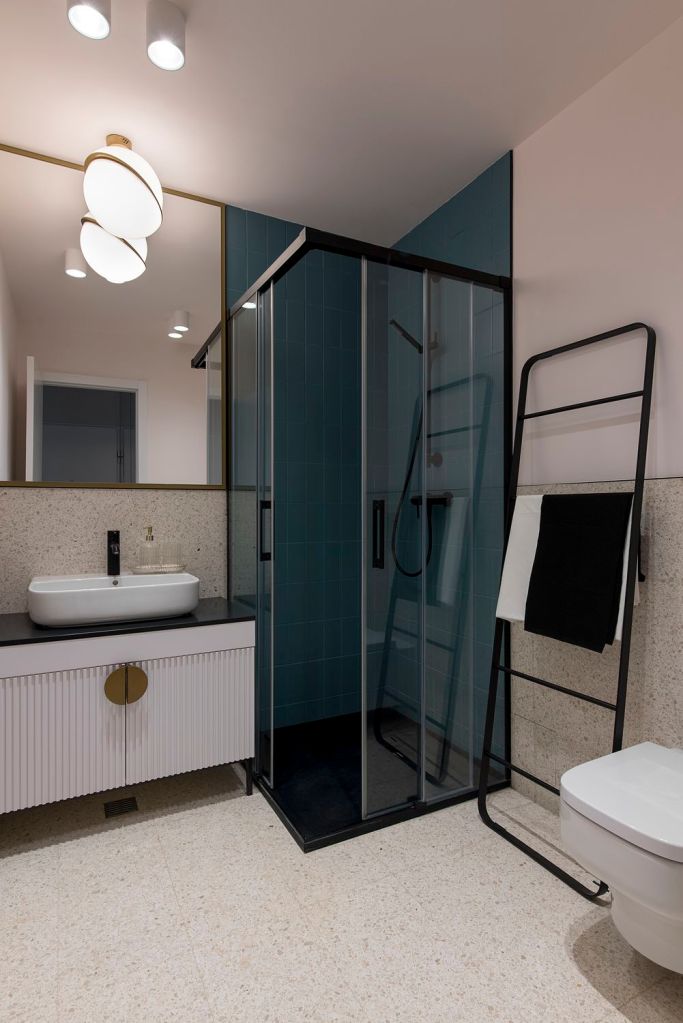 Baia respectă tematica întregii amenajări, de la fronturile canelate la dulapului la accentele de culoare și rafinamentul corpurilor de iluminat. Pentru a câștiga spațiu, arhitectele au ales o cabină de duș în locul unei căzi și au marcat zona cu faianță într-o culoare contrastantă cu restul finisajelor.