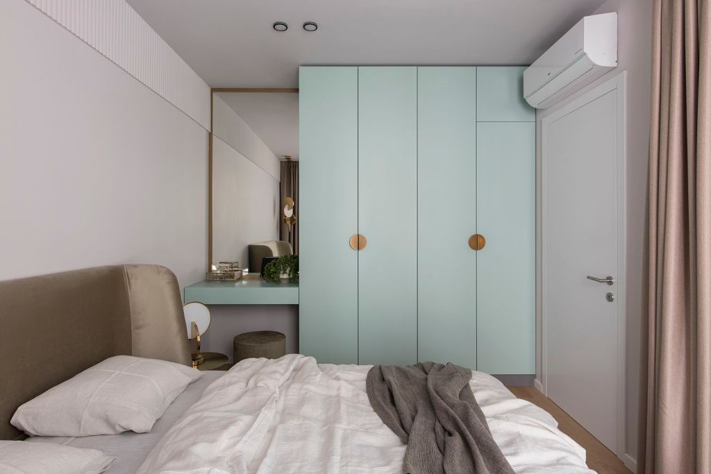 În dormitor sunt preluate cu preponderență culorile din living și dining. Excepție face ansamblul format din dulap și măsuță de machiaj, lucrat pe comandă din MDF vopsit într-un verde mentă pastelat. Corpurile de iluminat sunt asemenea unor bijuterii ce completează perfect ținuta elegantă a camerei. Acestea sunt asortate măsuțelor folosite pe post de noptiere.