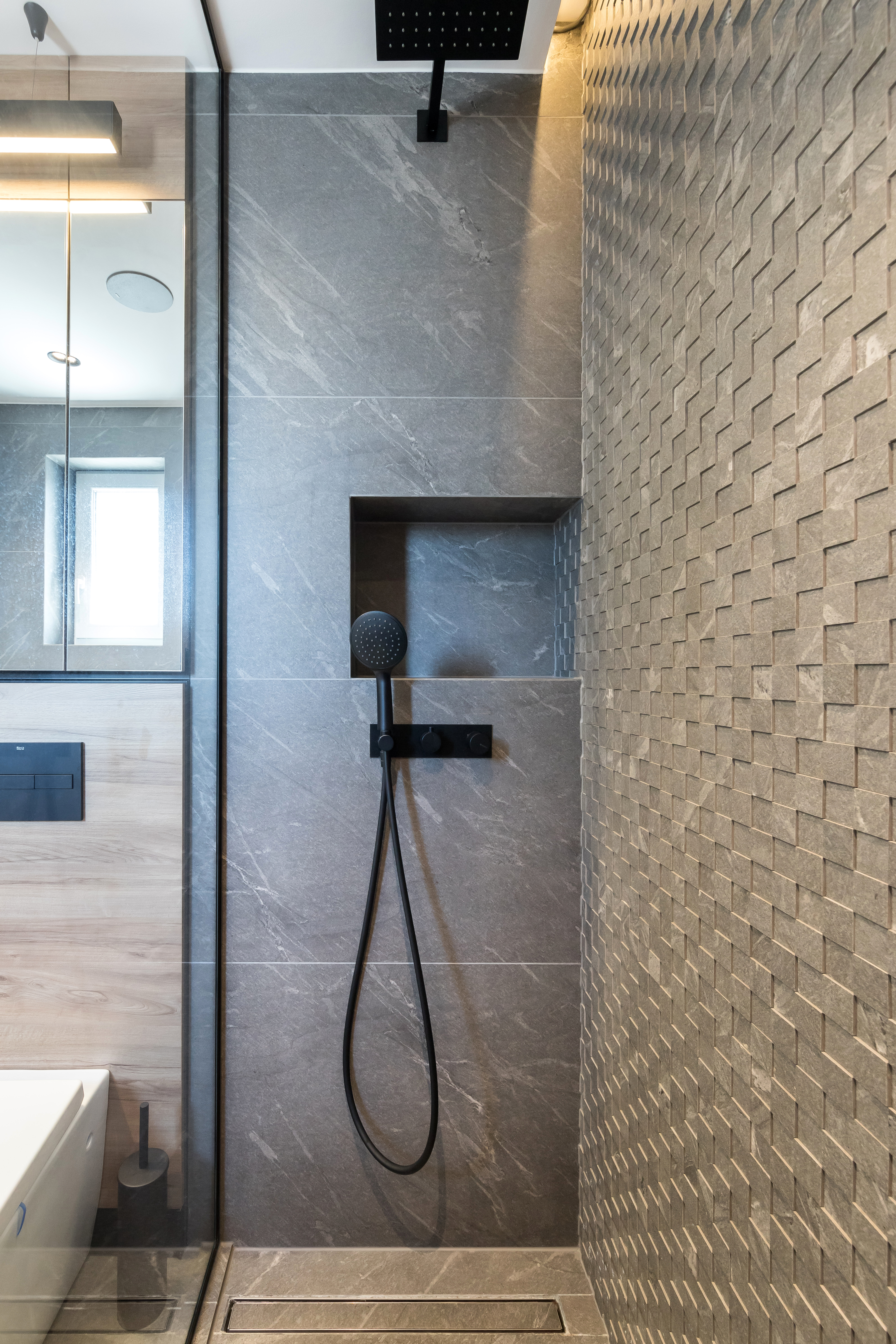 Peretele accent din zona cabinei de dus este placat cu mozaic debitat din același finisaj cu restul placărilor ceramice. Acesta este evidențiat de iluminatul ambiental LED, prevăzut la nivelul tavanului, printr-o scafă special creată.