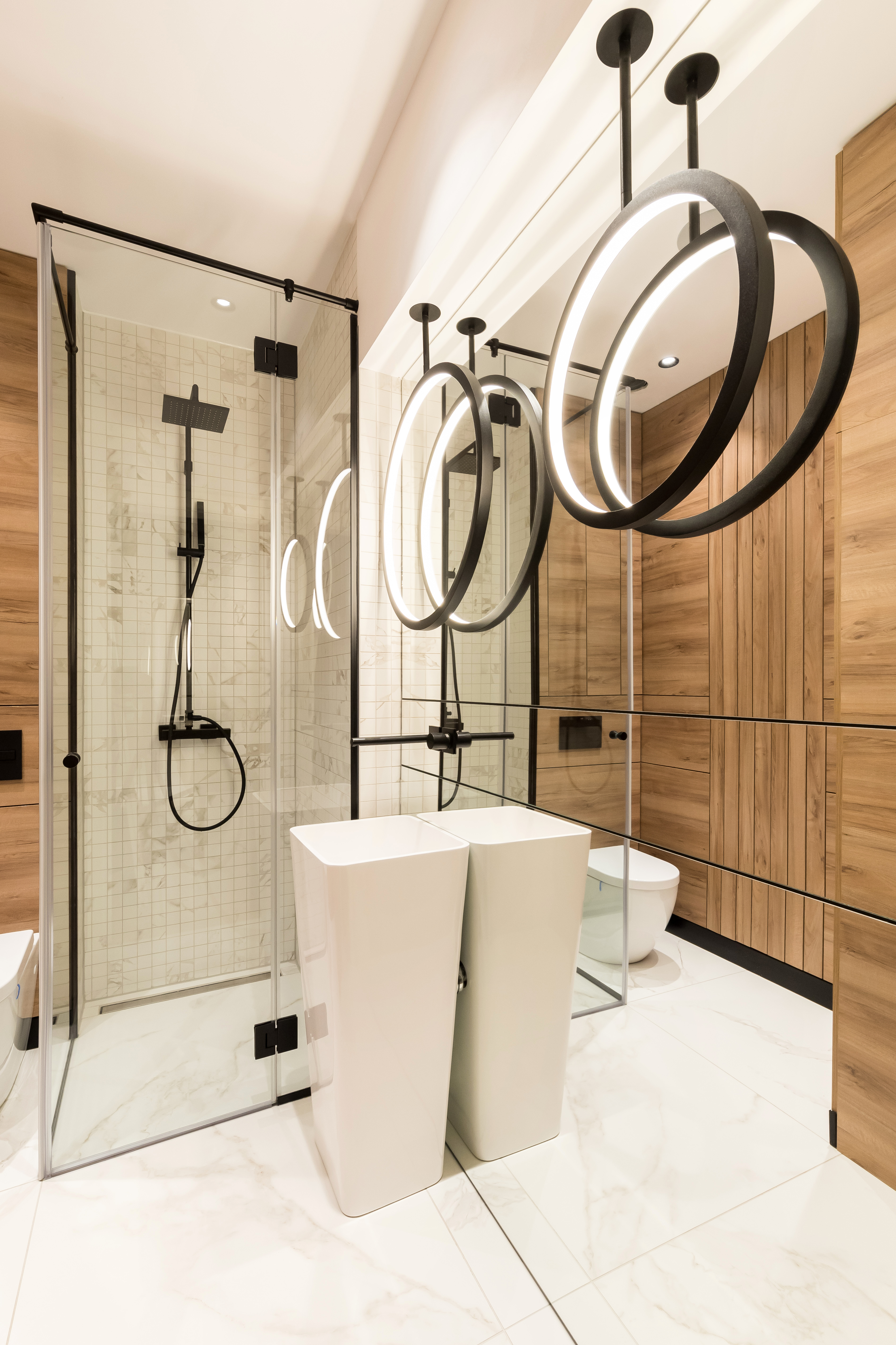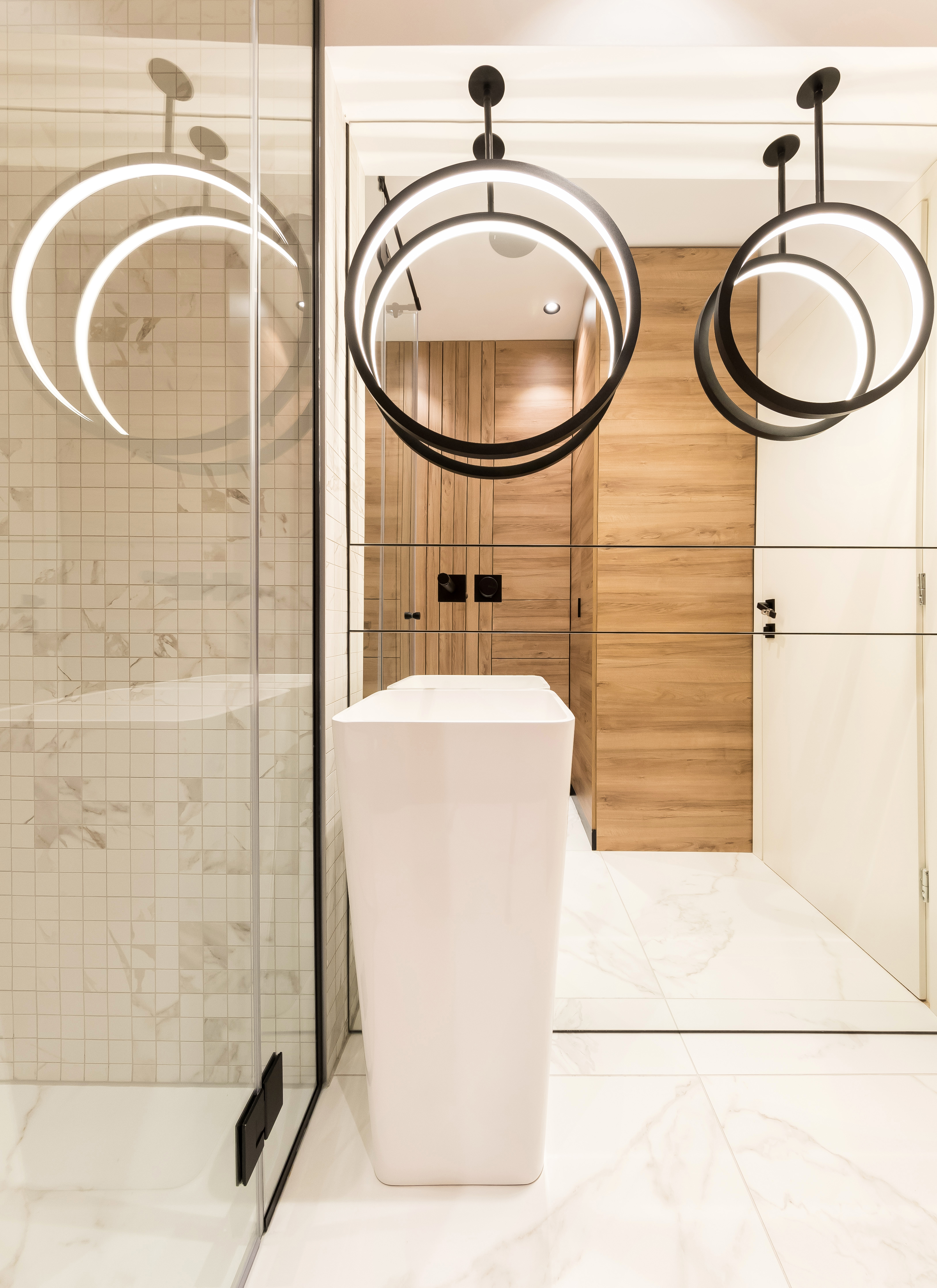 • Corpurile de iluminat circulare, de tip LED, din baia mică sunt de la Lightem;
