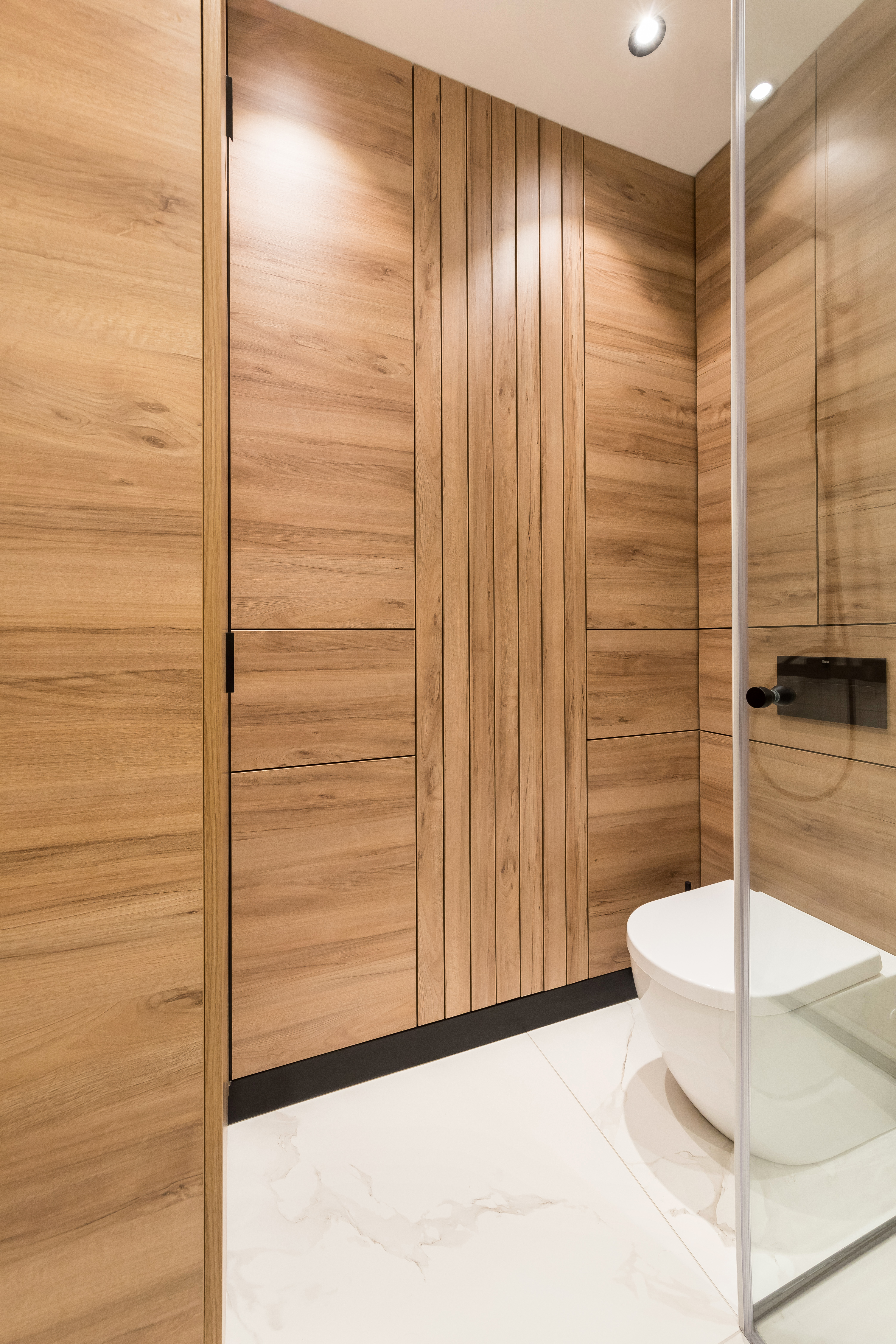 „Pentru a evita supraîncărcarea spațiului mic pus la dispoziție și pentru a masca cele două aparate, am creat un mobilier compact, care le înglobează pe amândouă și care se continuă sub formă unei placări din lemn pe restul peretelui, până în zona cabinei de duș, creând astfel o unitate vizuală armonioasă”, explică arhitecții.