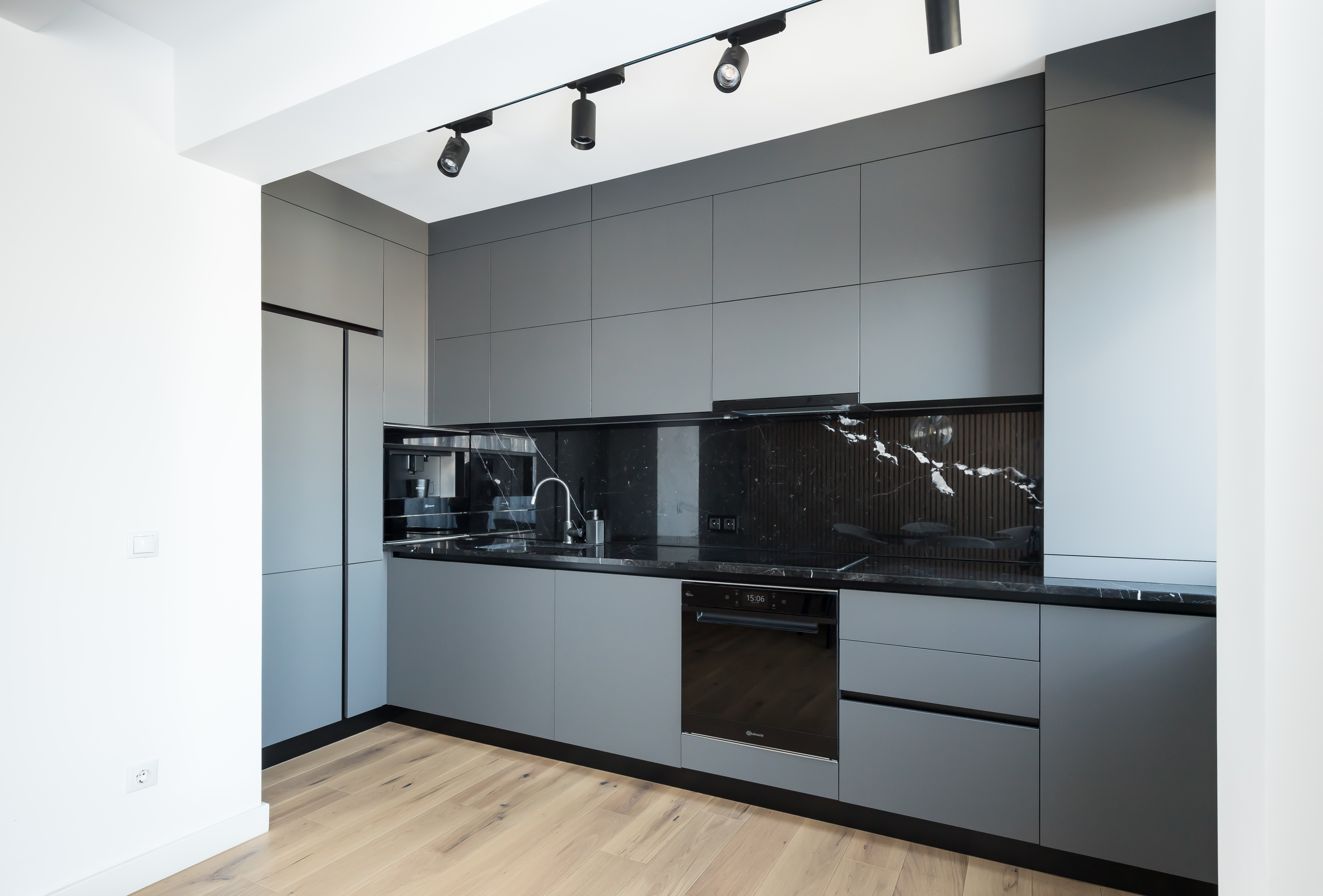 În bucătărie, toată aparatura electrocasnică este încorporată în mobilier pentru a se putea face trecerea lină spre zona de zi.