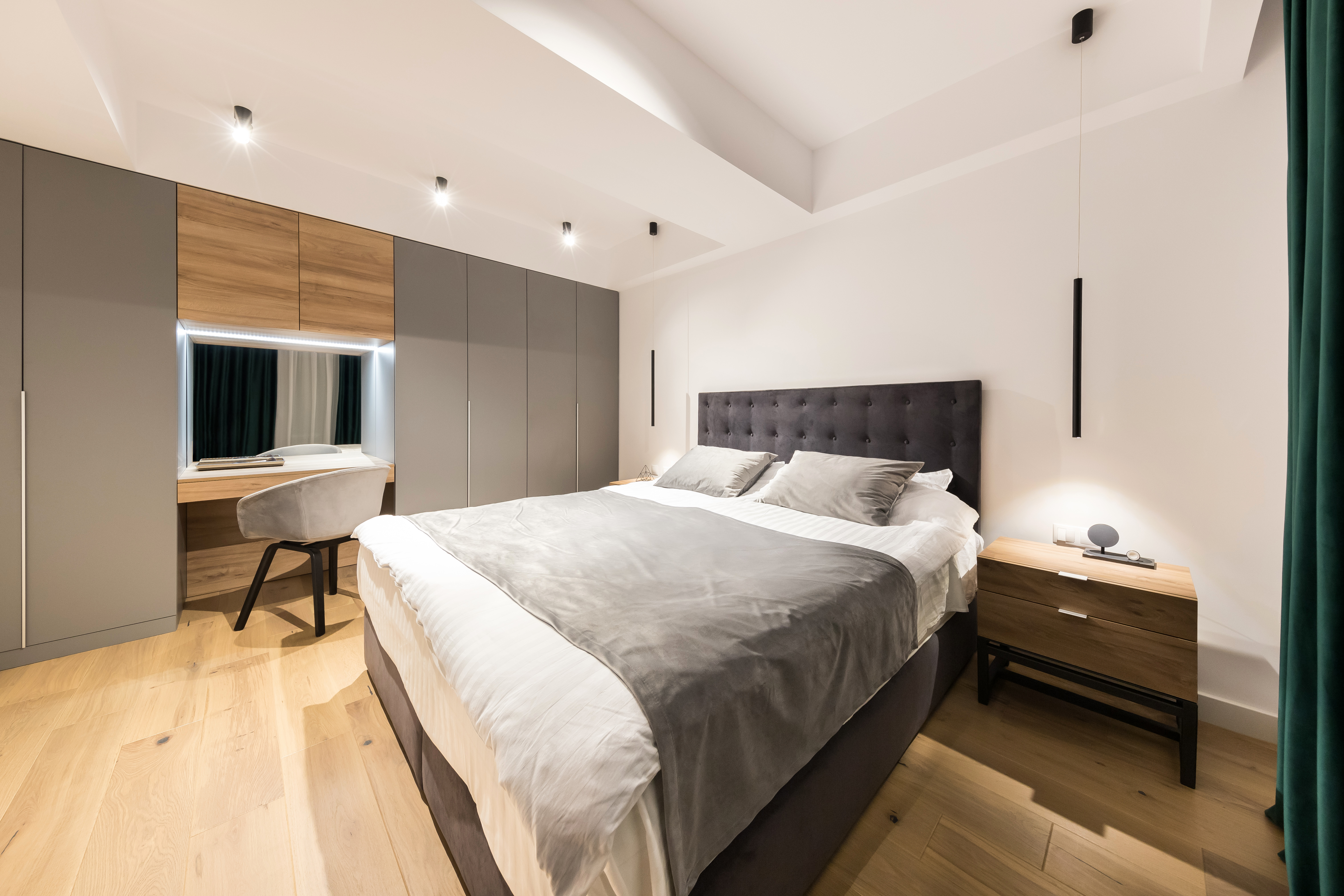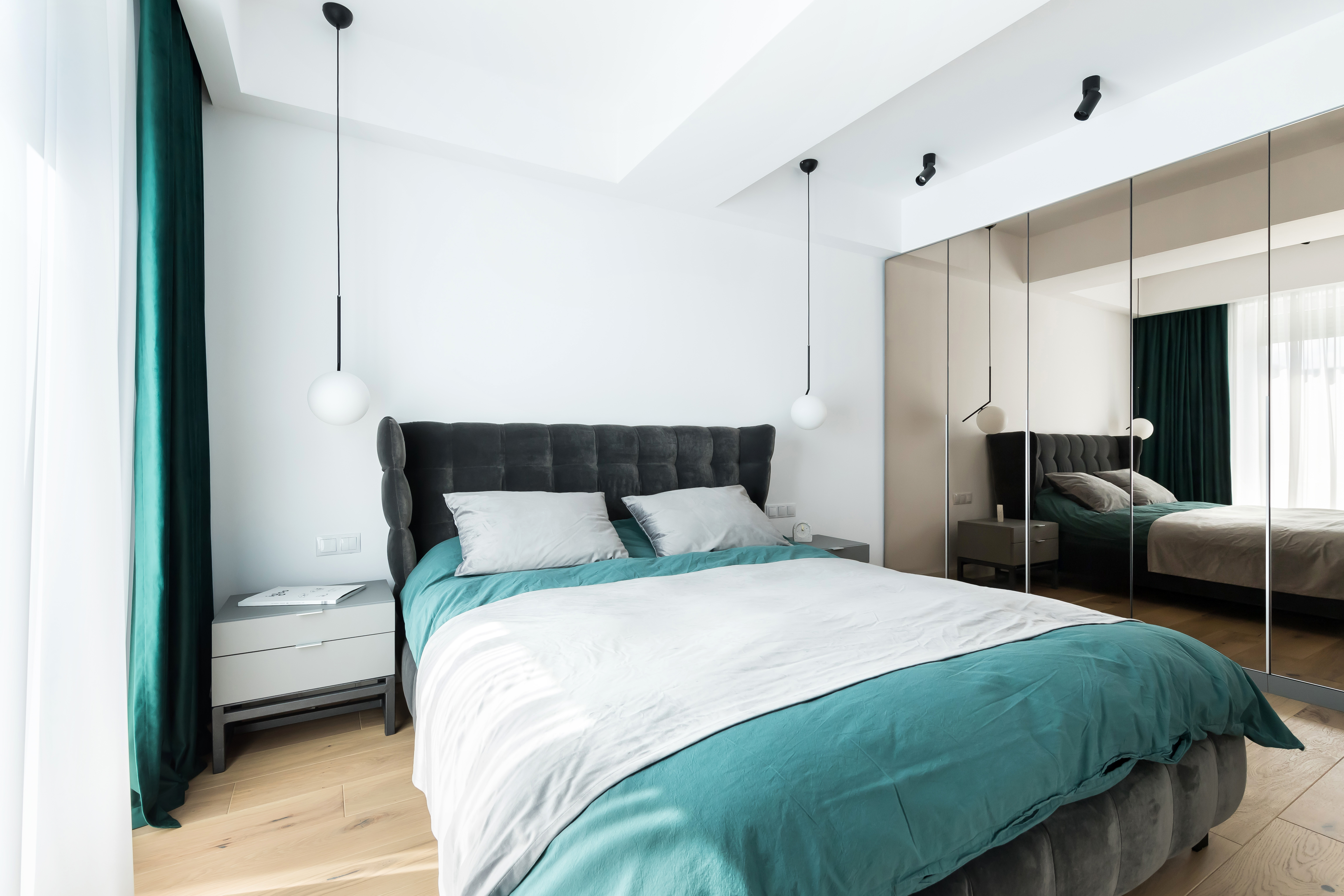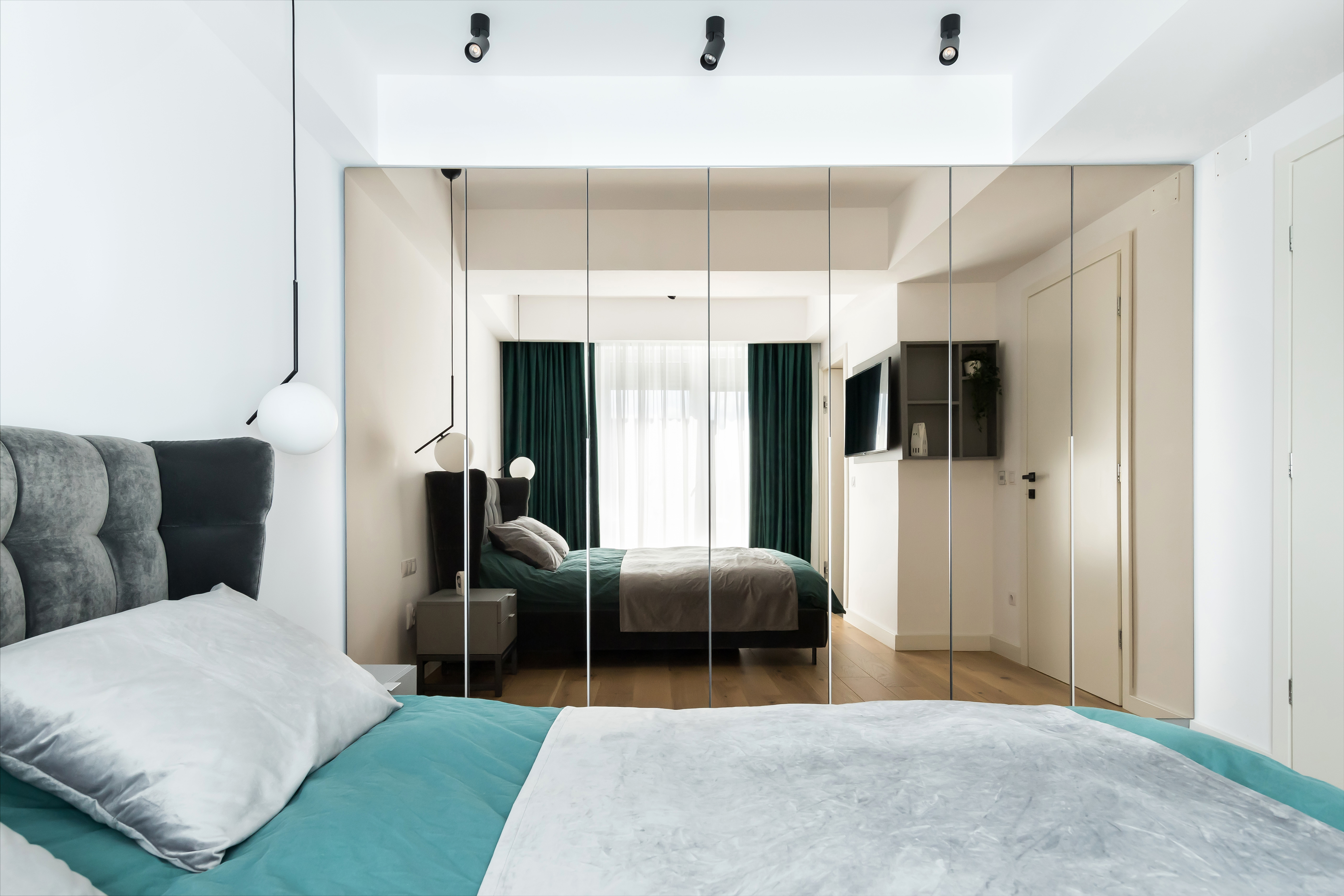 În zona dormitorului matrimonial, fronturile dressingului generos au fost placate cu oglindă, pentru a mari vizual încăperea și pentru a reda senzația de profunzime.