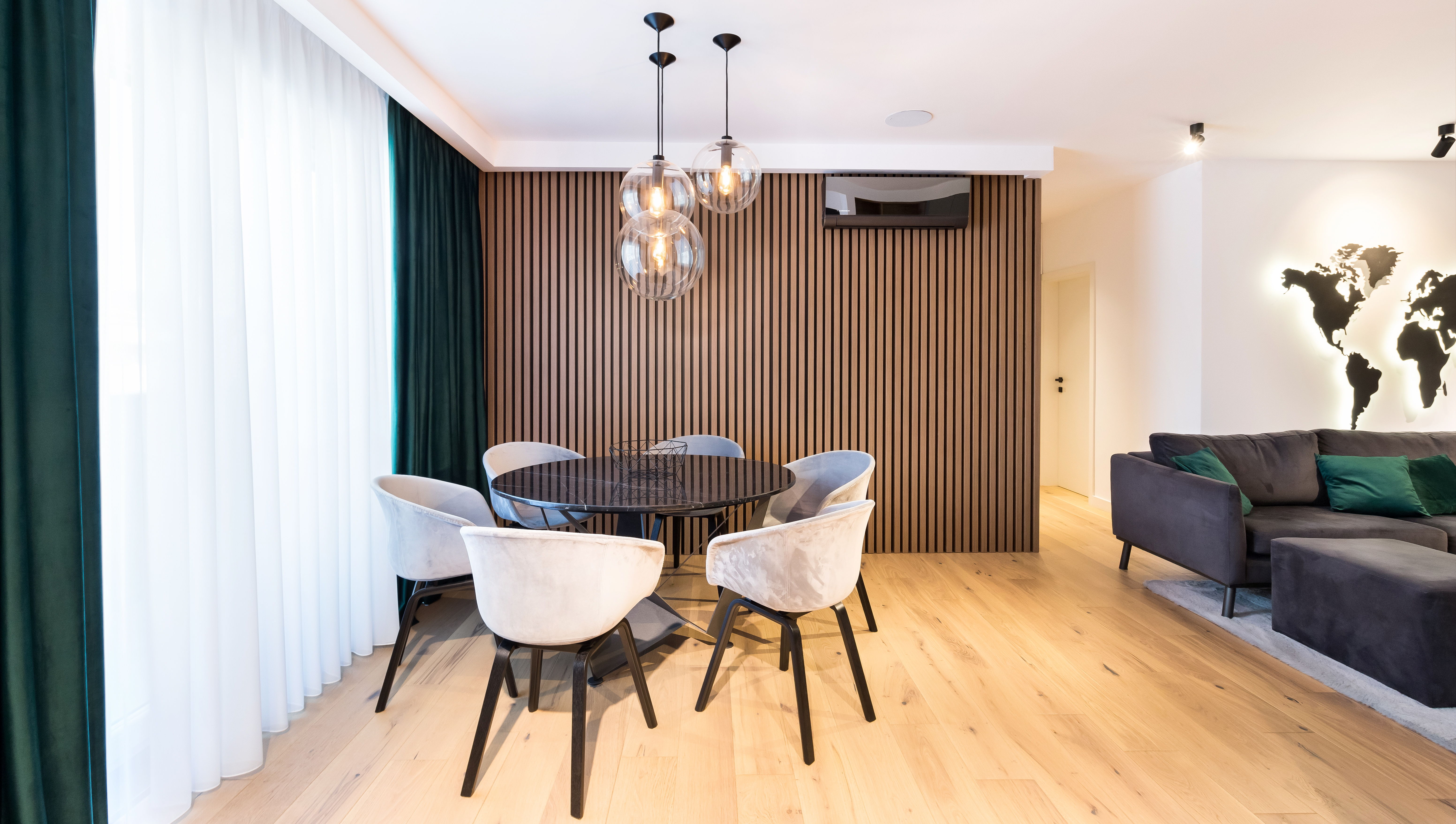 Zona de dining este delimitată vizual într-un mod subtil, prin schimbarea texturii la nivelul peretelui adiacent: finisajul alb mat este înlocuit de lamele verticale din lemn.  Corpurile de iluminat suspendate sunt alcătuite într-o compoziție dinamică, prin decalarea lor la nivel de înălțime și prin diametrul diferit al fiecărui corp de iluminat în parte (trei dimensiuni diferite ale globurilor din sticlă).