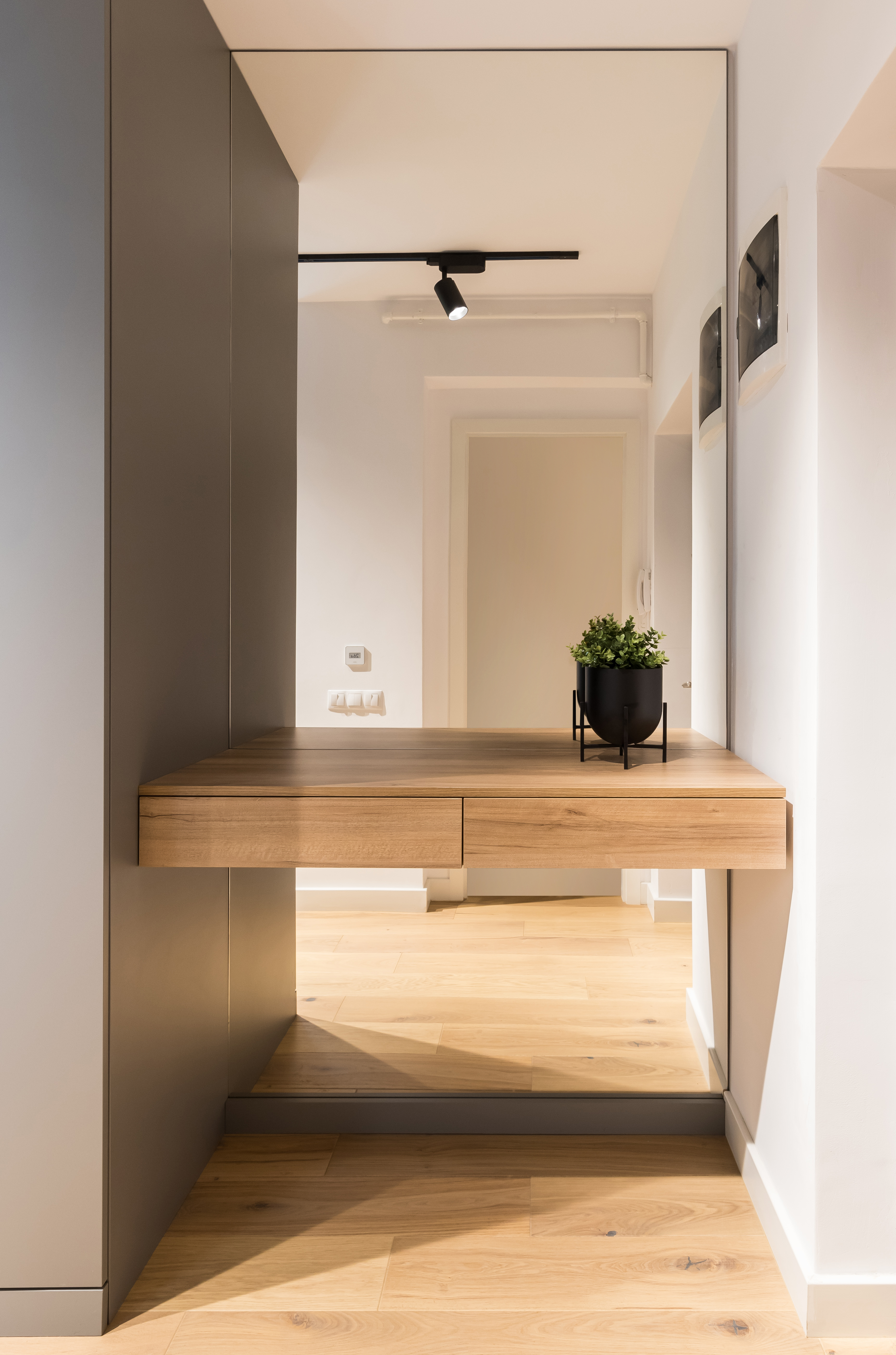 Sonia și Andrei au găsit soluții ingenioase pentru optimizarea spațiilor de depozitare și mărirea vizuală a dormitoarelor și a băii de la intrarea în apartament: au construit un dressing care pornește din hol și ajunge până-n living.