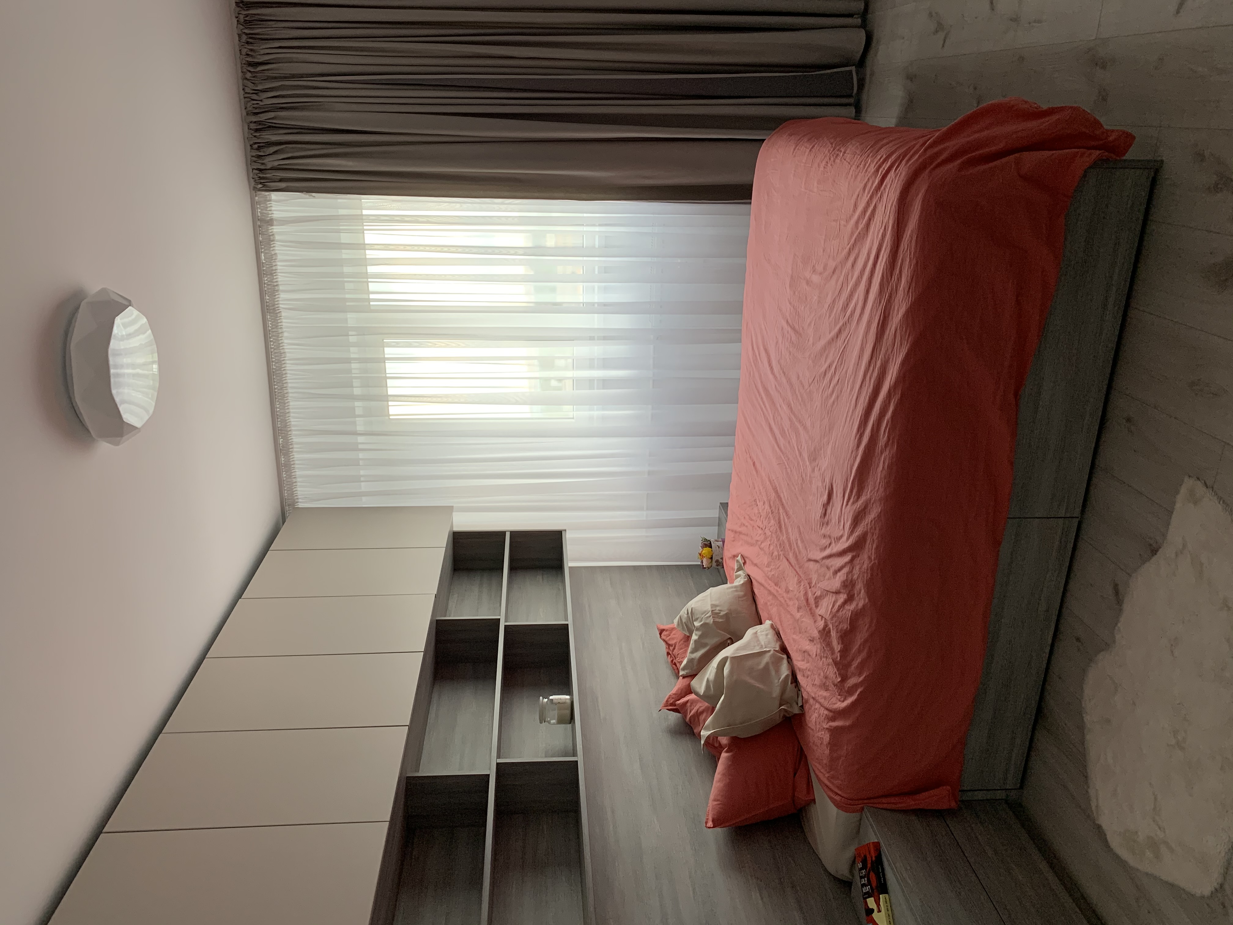 Cea mai mare provocare: Dormitorul. Am colindat aproape toate magazinele de mobilă pentru dormitoare. Eu visam la un dormitor mobilat cu un dressing mare, un pat matrimonial de 180×200 și o măsuță de toaletă. Însă din cauza dimensiunilor dormitorului nostru (lungime 287 centimetri și lungime 390 centimetri) și cu o grindă pe tot peretele drept, azi dormitorul nostru nu arată deloc așa. Am făcut o mobilă la comandă mai mult decât potrivită pentru dormitorul nostru, ce îți dă senzația de un spațiu mult mai mare, destul de încăpător și primitor.