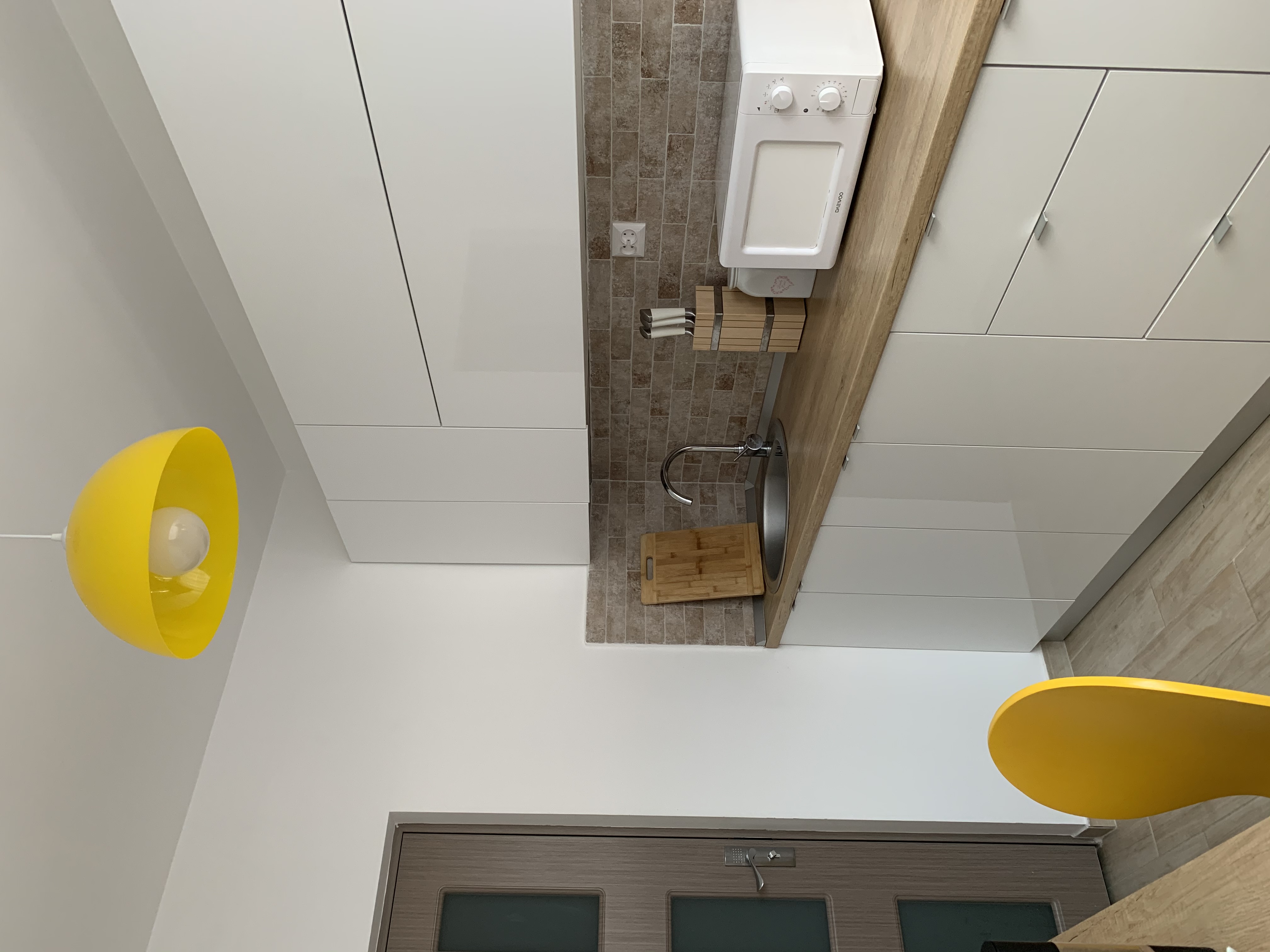 Deşi lungă şi îngustă, așa cum sunt majoritatea bucătăriilor din blocurile vechi, Oana a reuşit să-i dea farmecul pe care şi-l dorea printr-un design simplu, cu câteva pete de culoare: scaunele şi lustra galbene.