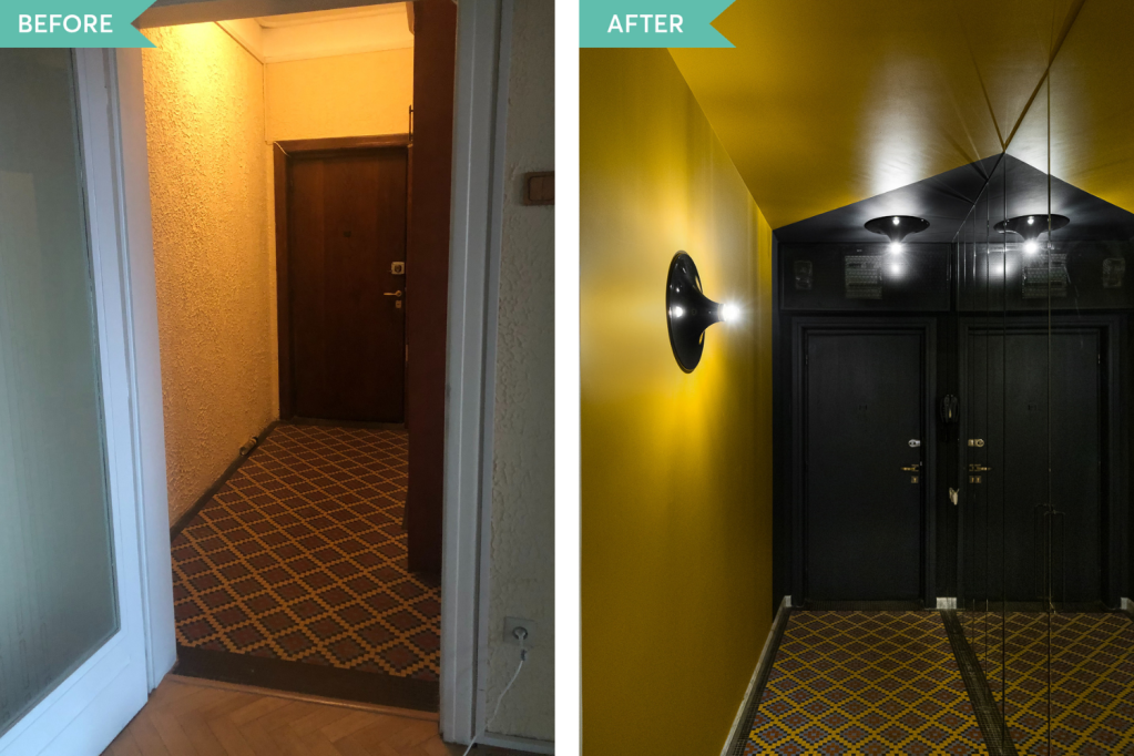 Într-unul dintre holuri, în baia mică și în dormitorul nou obținut (cel în care era inițial bucătăria) pardoseala este din microgranit. Inițial, aceste zone aveau pe jos gresie, iar Anna și Maria nu au vrut să pună un alt parchet, având în vedere că l-au păstrat pe cel original în restul apartamentului. „Am ales soluția microgranitului pentru că nu am vrut să avem două feluri de parchet în aceeași casă plus că se potrivește perfect cu celelalte elemente”, explică Anna Chițan.