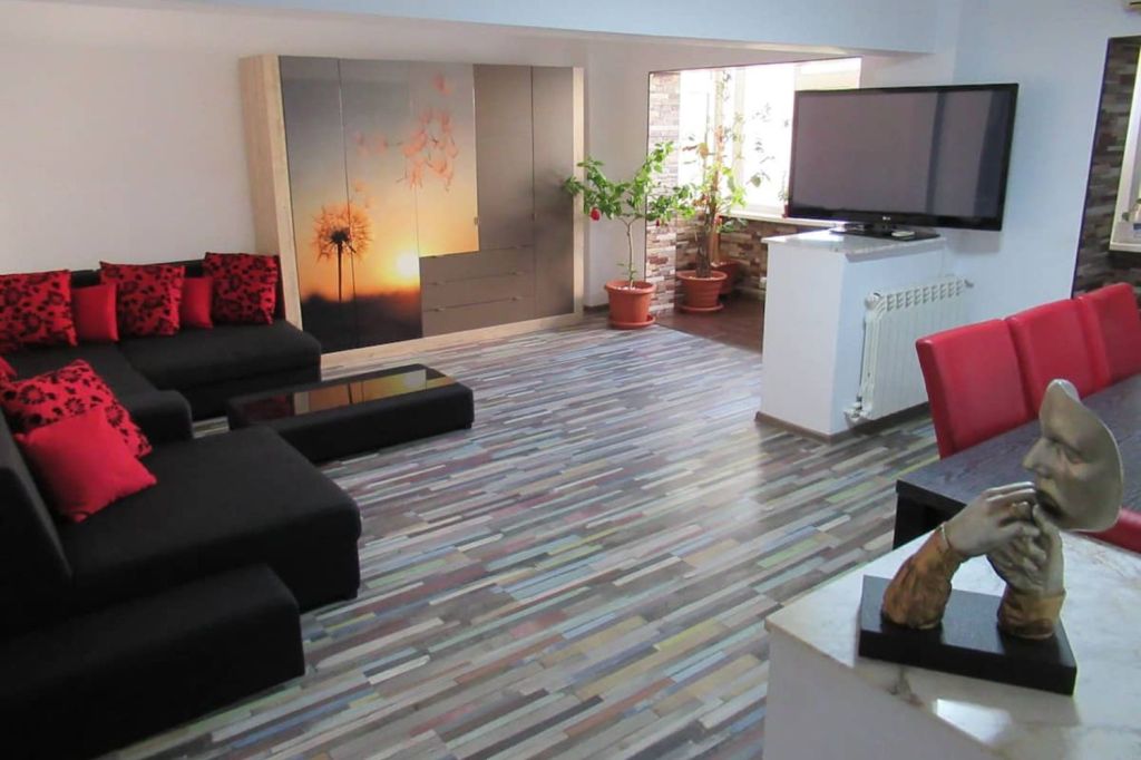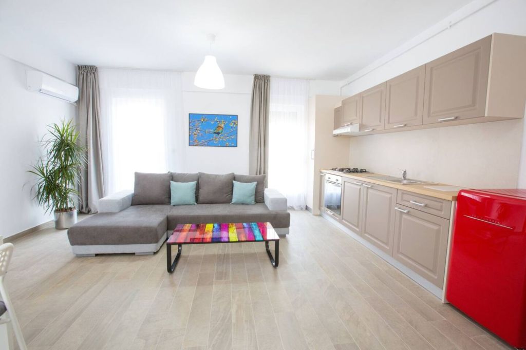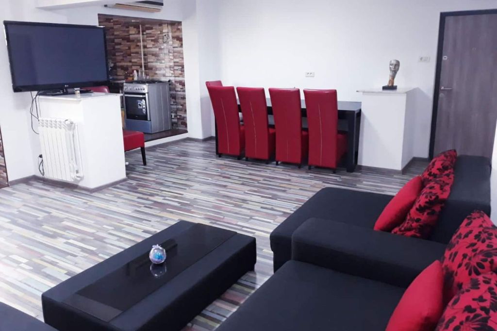 Această a doua alegere propune o atmosferă mai colorată și, deci, ceva mai veselă, grație tonurilor de roșu din living. Apartamentul este situat într-un bloc nou și are o terasă impresionantă cu vedere la complexul Palas Mall, de unde poți privi jocul de artificii la miezul nopții. Promite maximum de confort și are utilități moderne. Bucătăria și baia sunt echipate cu tot necesarul, iar WiFi-ul este la dispoziția ta.