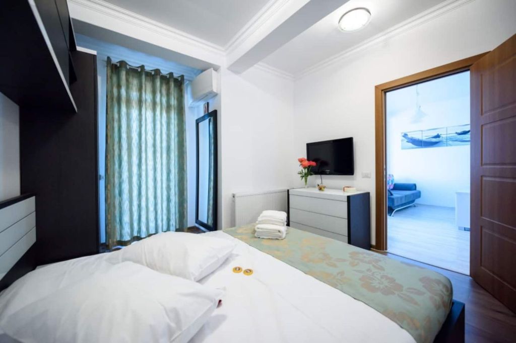 Apartamentul din imagine a fost construit de la zero în 2017 și complet echipat, iar blocul este situat într-o locație centrală, dar pe o stradă liniștită. Nu că noaptea de Revelion ar fi una de genul ăsta. În plus, priveliștea apartamentului este spre orașul vechi. În rest, n-ai decât să te simți ca în vacanță aici. O casă decorată vesel, cu bucătărie complet echipată, sistem TV și WiFi gratuit și două băi spațioase. Un spațiu șic și luminos, pe care îl pot împărți cu alte maximum cinci persoane.