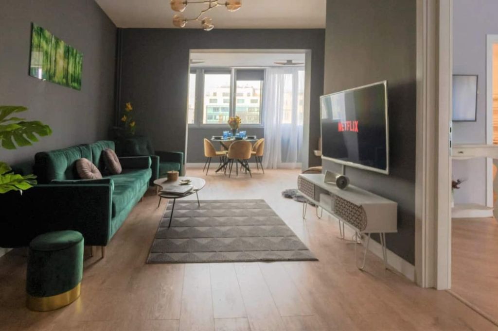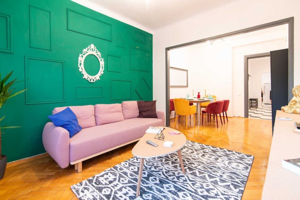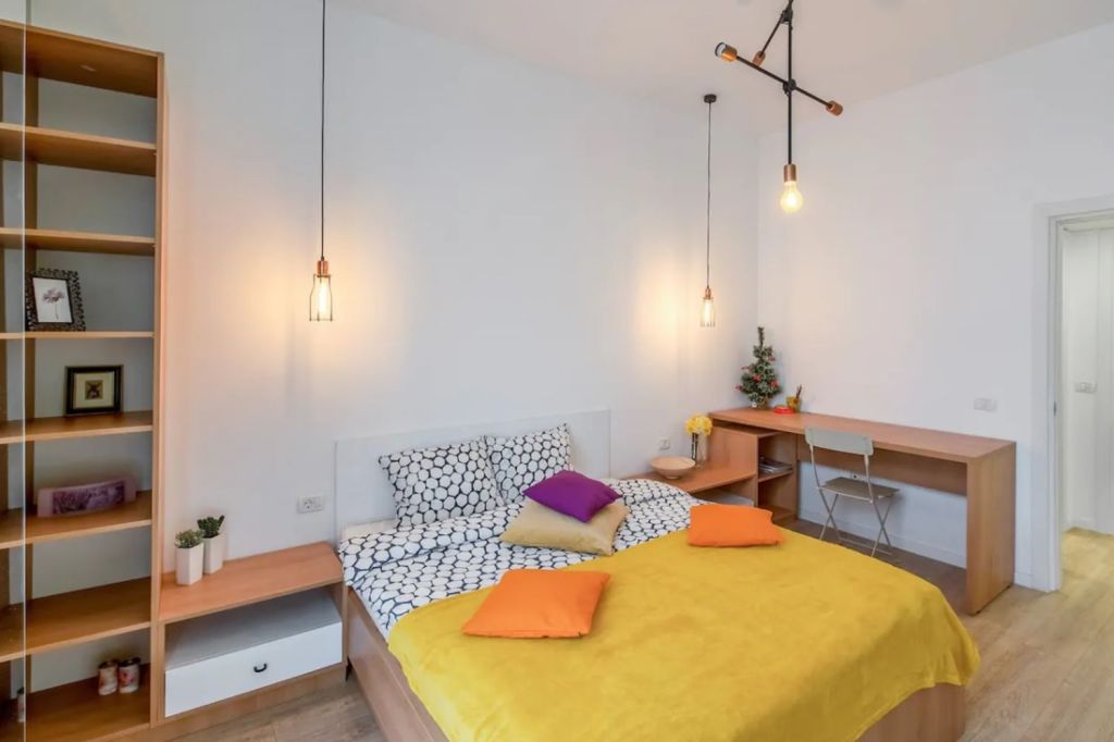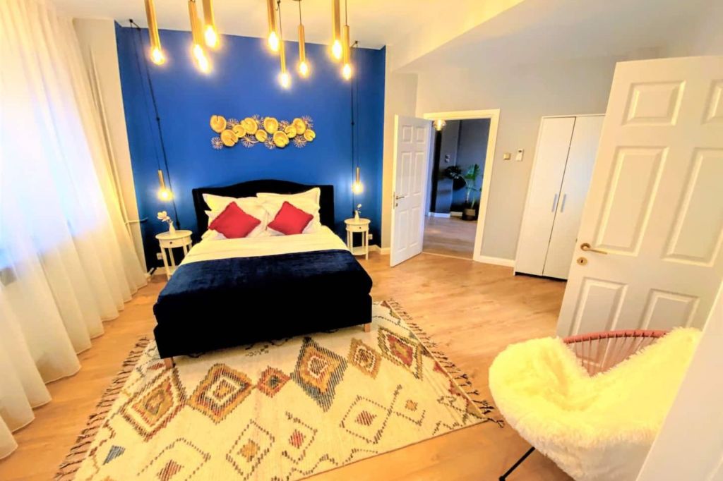 La fel de fancy și pregătit de o cină festivă e și al doilea apartament propus în București, în apropierea Centrului Vechi, fostul kilometru zero al distracției într-un oraș închis azi de pandemie. Decorul este modern-eclectic, în culori vibrante și vesele, perfect pentru a face trecerea între ani. Dacă vrei un Revelion liniștit, în living găsești o canapea confortabilă și un smart TV la care să vizionezi filmele tale preferate de pe Netflix sau HBO. Alături de amici și de un pahar de șampanie, desigur.