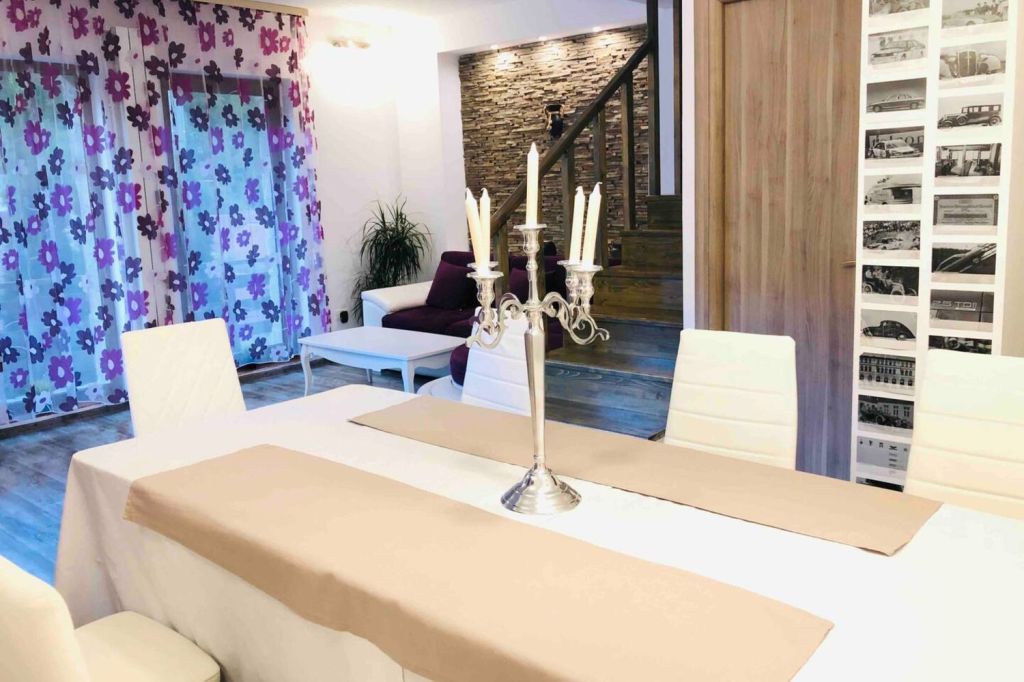 În orașul de pe Tâmpa am găsit un loc care să găzduiască un grup mai mare de prieteni. O vilă, mai exact, decorată foarte familiar și cochet și destul de spațioasă pentru ca tu și prietenii tăi să organizați noaptea de Revelion. Ca orice vilă care se respectă din zona montană, dispune de o terasă și un loc pentru grătar. Un grătar pe care îl puteți servi în living, pe masa generoasă și ornată elegant, chiar și cu un sfeșnic argintiu.