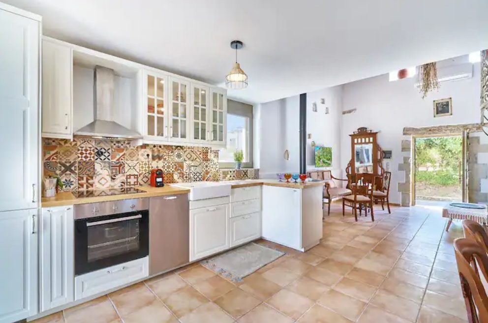 În satul aflat la 25 minute de mers cu mașina de orașul Chania, te așteaptă o locuință generoasă, albă și decorată elegant-tradițional, care se pretează unui cuplu sau unei familii cu un copil. Spațiul are un dormitor, zonă de luat masa și cameră de recreere, o canapea extensibilă în lounge și bucătărie complet utilată. Pe terasă există șezlonguri și un grătar, iar de la balcon poți admira portocalii exotici de pe proprietate. Satul te îmbie și el cu numeroase taverne non-turistice, pentru ca tu să te simți ca un adevărat cretan.