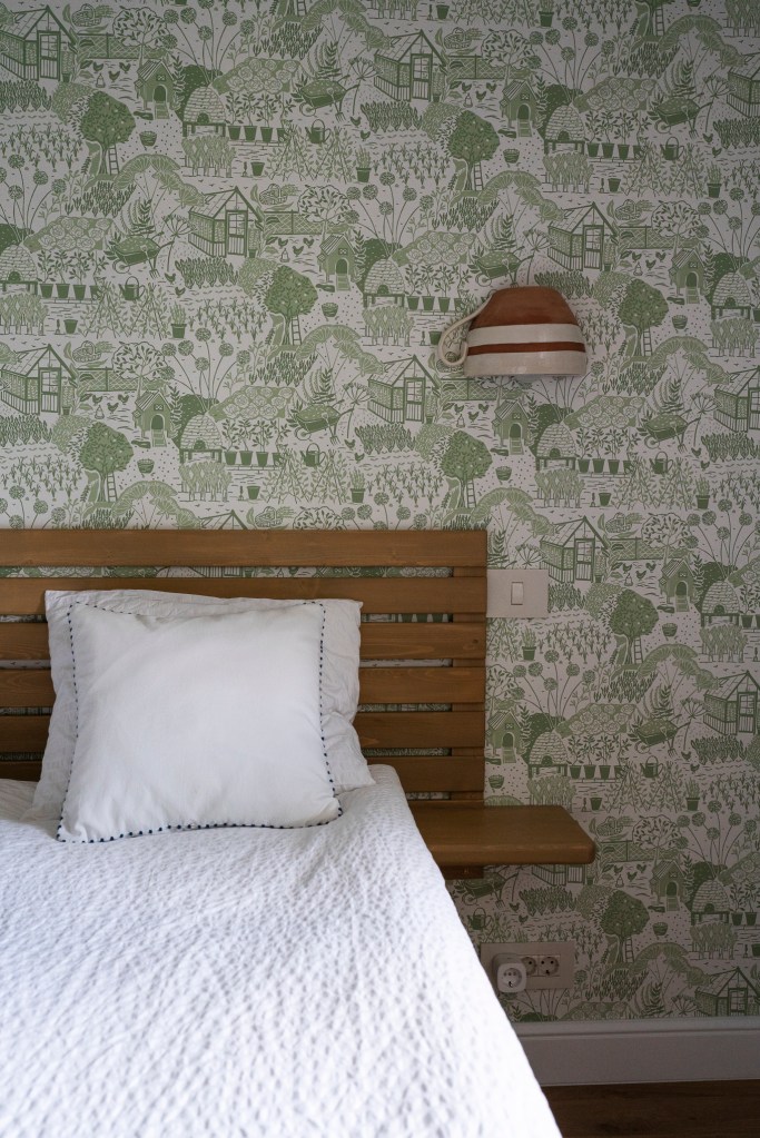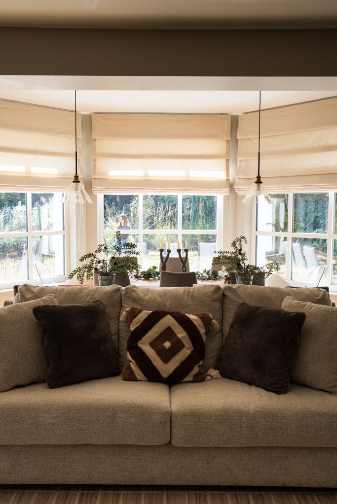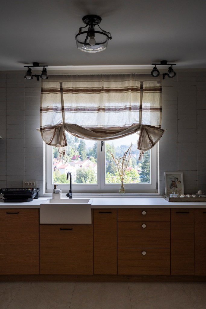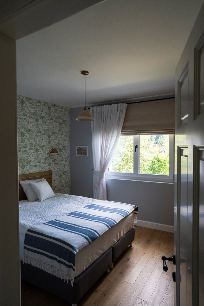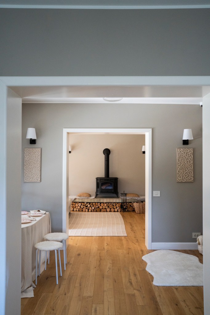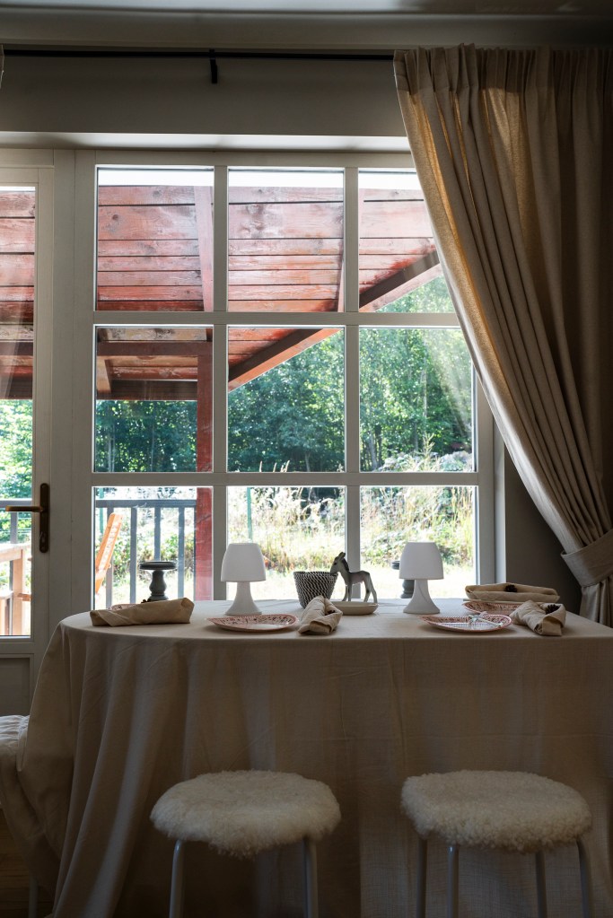 Amenajarea casei integrează multe elemente inspirate din peisajul de afară. Predomină lemnul, materialele naturale, imprimeurile care fac trimitere la frumusețea zonei. Teodora a gândit cromatica interiorului în strânsă legătură cu cea din exterior.