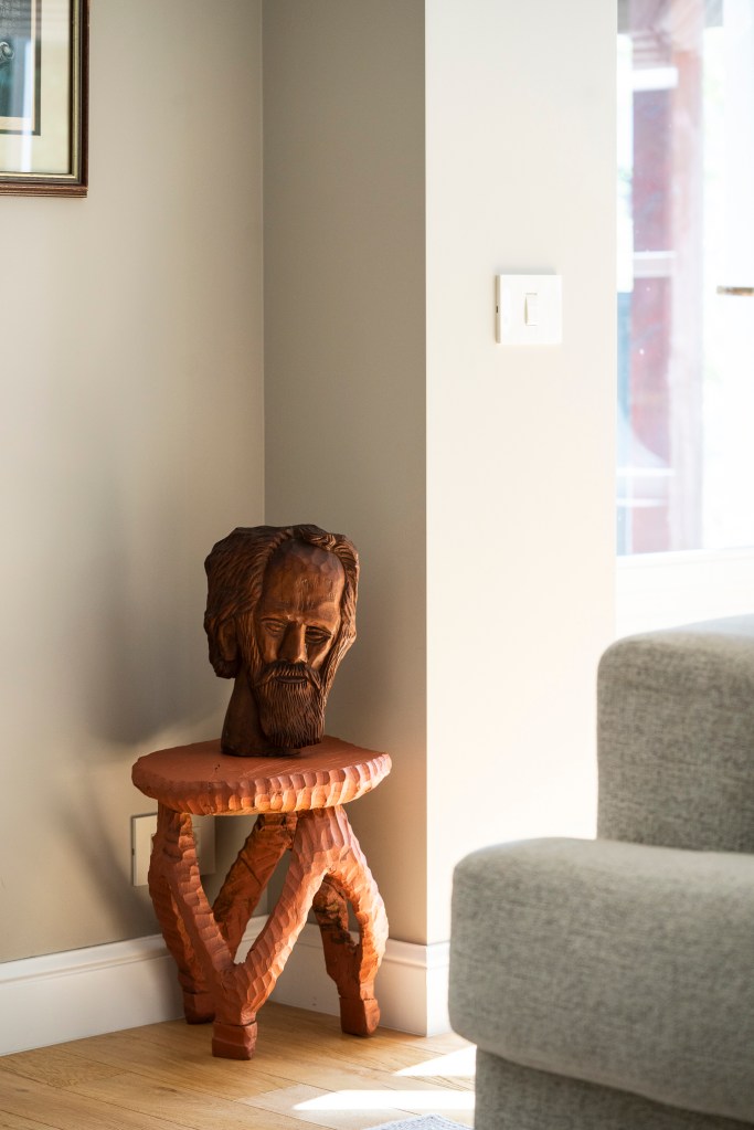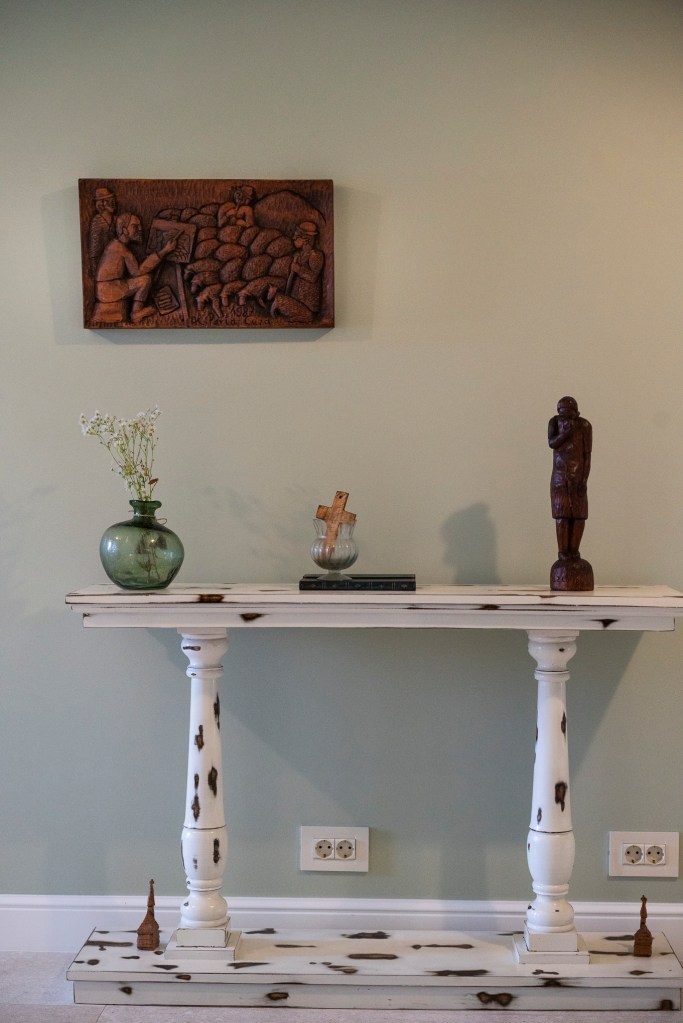 Teodora nu a vrut să aglomereze prea mult interiorul, dar a insistat ca obiectele din amenajare să aibă o poveste. A ales piesele mici de mobilier, în general, din târguri de antichități. Cât despre decorațiuni, are multe lucrări semnate de artiști români, mai ales de sculptorul Perta Alexandru. De altfel, numele casei, „Pertal”, derivă din numele artistului.