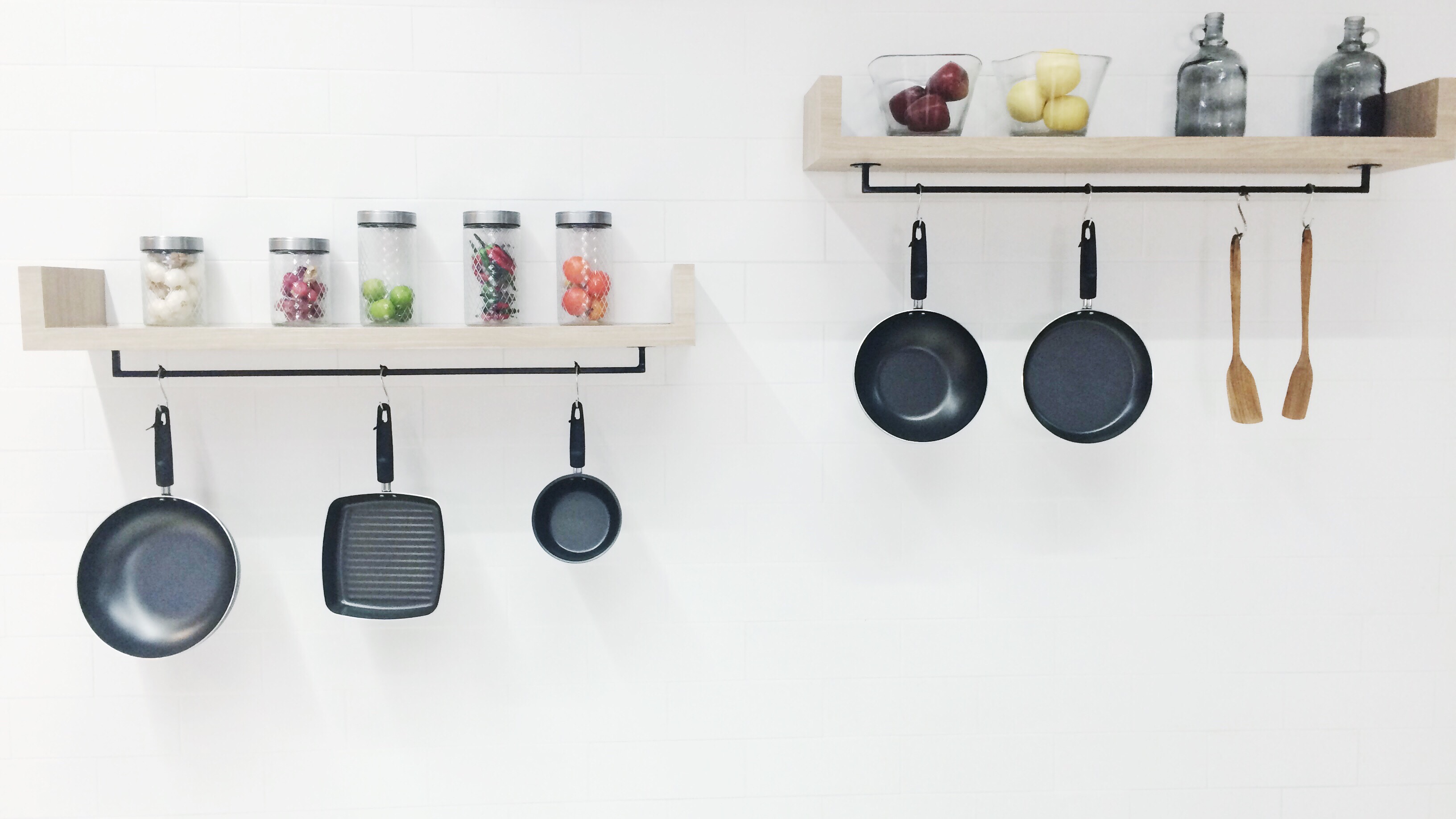 Dacă ai porțiuni goale de perete în zona în care gătești, pune pe ele suporturi pe care să poți agăța tigăile sau oalele. Poți cumpăra un panou gândit pentru așa ceva sau te poți juca și îți poți construi de la zero accesoriile.