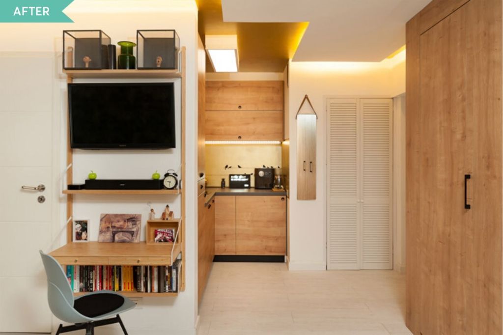 4. Livingul de 14 metri pătrați al unui studio include și bucătărie, și birou, și un loc de luat masa