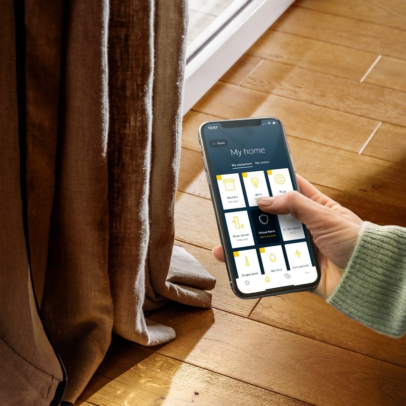 Apoi, pentru iluminat, modulul Izymo io e o mică bijuterie tehnologică: îl montezi în spatele întrerupătorului și, dintr-o dată, lumina clasică devine inteligentă. Poți aprinde, stinge sau regla intensitatea direct din aplicația TaHoma — sau chiar prin voce, dacă folosești Google Home sau Alexa.