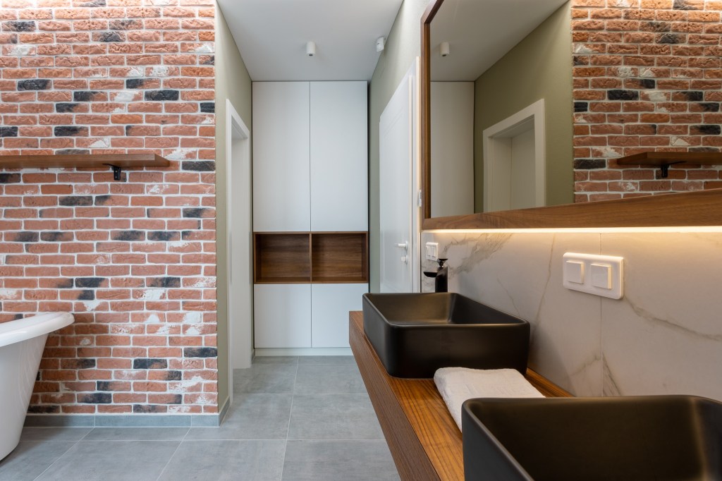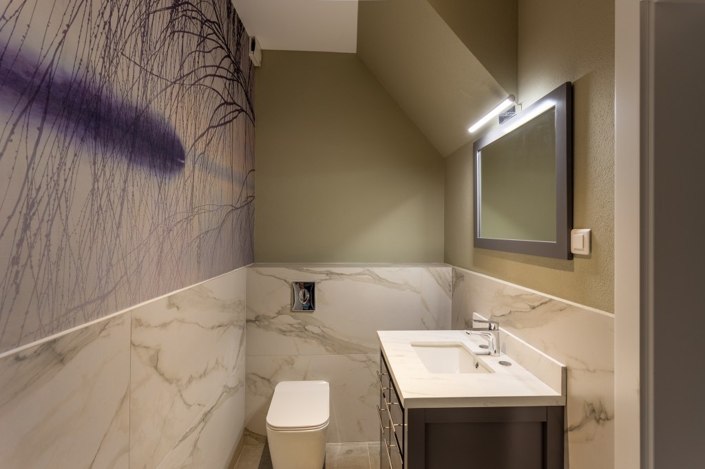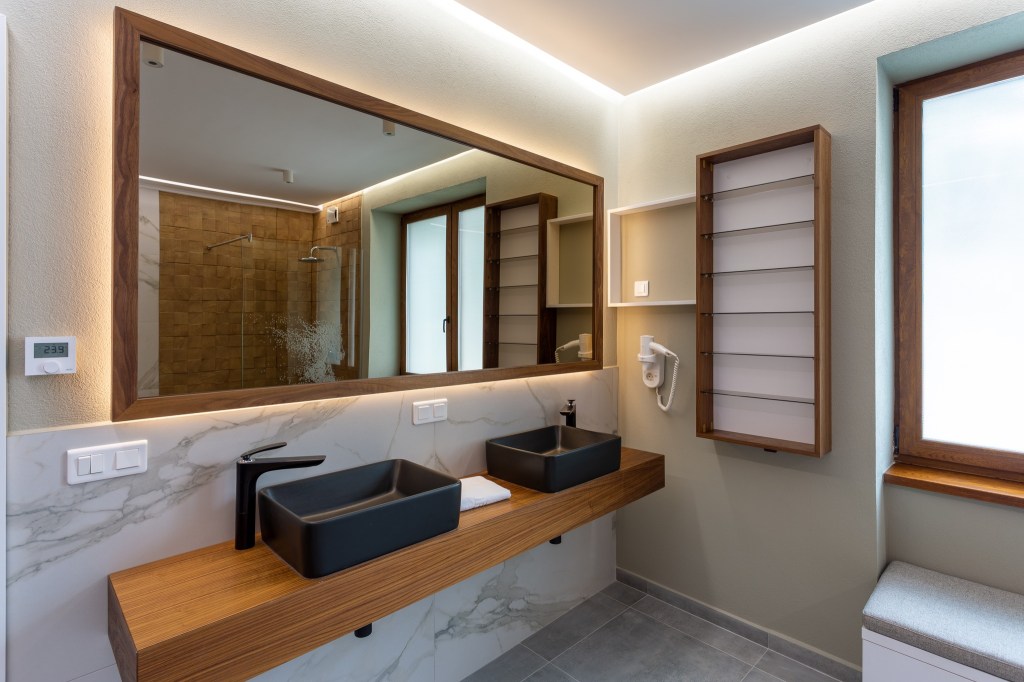 Baia matrimonială dispune de zonă de lavoare cu oglindă iluminată cu bandă led. Amenajarea include cabină de duș, cadă și spații de depozitare. Partea de vas de toaletă, care poate fi considerată o baie de serviciu, se află într-o zonă separată. Accesul în această încăpere se face atât din baia matrimonială, cât și din hol.