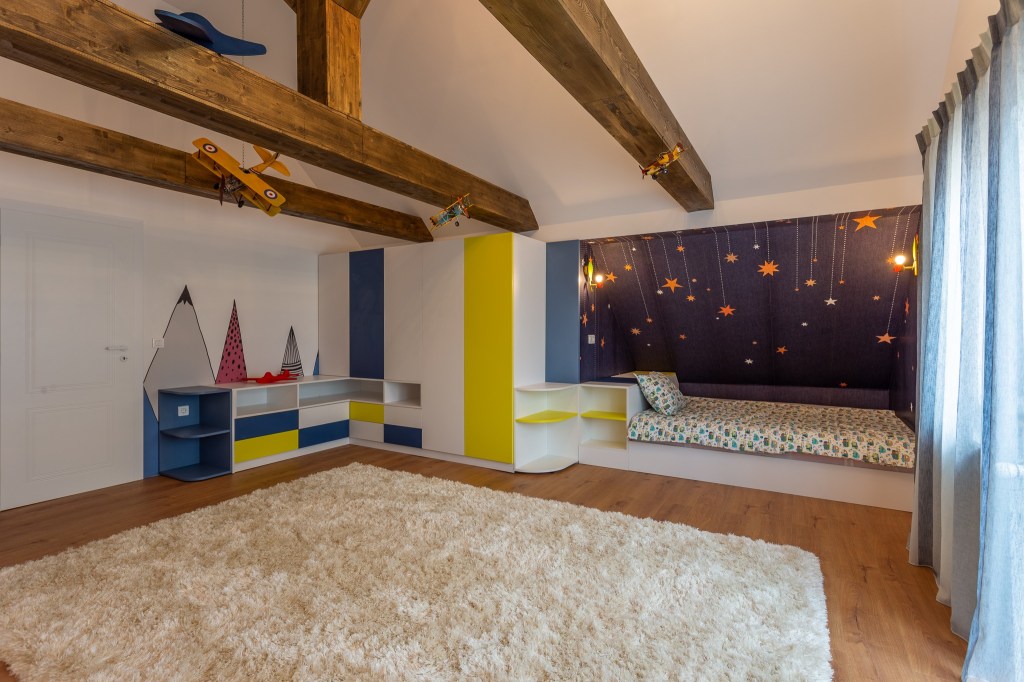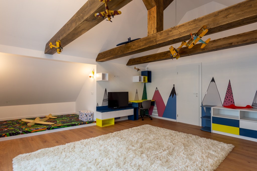 Camera copilului, situată la etaj, este înaltă și spațioasă, cu mobilier făcut pe comandă care să acopere tot necesarul de depozitare. Există două nișe în colțuri opuse ale încăperii: una pentru odihnă, și alta pentru joacă. Grinzile la vedere păstrează puțin din aspectul rustic în jurul căruia s-a conturat tot conceptul de amenajare, dar decorul este, evident, adapat vârstei celui mic. Avioanele vintage, agățate de tavan, sunt decorațiunile pereferate ale copilului proprietarilor, unele dintre ele fiind confecționate manual.