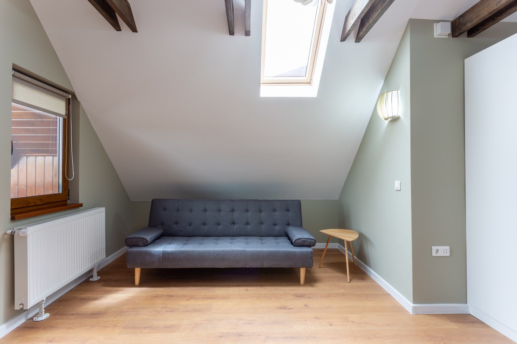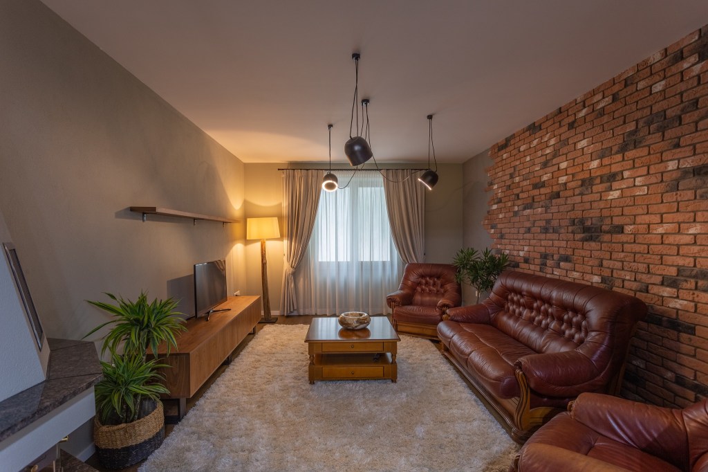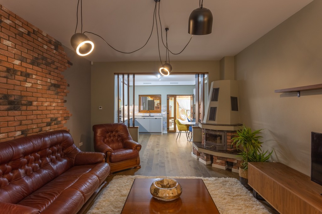 Livingul și bucătăria formează un open space generos, pe care îl sparg ușor doar câteva riflaje din lemn. În zona de living, mobilierul este minimal: o canapea Chesterfield și două fotolii, măsuță de cafea, televizor, comodă și un șemineu, în colțul camerei. Interiorul este însă cald și primitor, iar atmosfera amintește, într-o oarecare măsură, de casele din Anglia rurală. Cromatica este una neutră cu tonuri de grej, folosite ca fundal, accentul fiind pus mai degrabă pe finisaje (cărămida aparentă) și pe inserțiile de lemn.