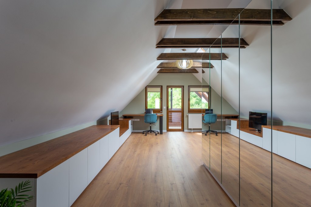 Cel de-al doilea dormitor funcționează ca birou, dar poate fi folosit, la nevoie, ca dormitor de oaspeți. Este o încăpere îngustă și lungă, cu ieșire în balcon. Robert a prevăzut și aici un spațiu generos de depozitare prin proiectarea unui dressing cu uși din oglindă.