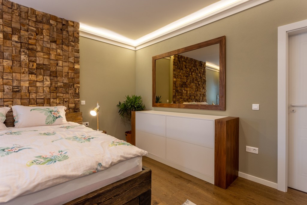 Dormitorul matrimonial include zona de dressing și baie. Și aici amenajarea pune accent pe confort și funcționalitate. Patul este o piesă care atrage toate privirile, nu doar prin prisma aspectului său rustic, ci și prin înălțimea neobișnuită. Interesantă este și tăblia, de fapt, o placare din lemn până în tavan, de la XTDeco. La cererea proprietarului, Robert a integrat în amenajarea dormitorului și o mică zonă de lectură. Fotoliul Barcelona, așezat în dreptul ferestrei, este unul dintre răsfățurile proiectului, dacă e să ne raportăm la costuri.