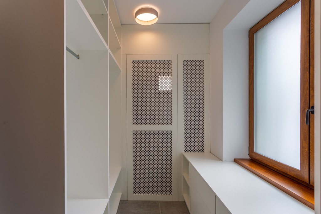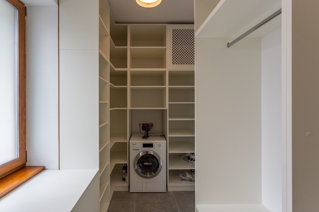 Deși nu a pornit cu un brief exact, Robert a avut ca misiune să organizeze în amănunt fiecare colț al casei. Proprietarii și-au dorit să aibă cât mai mult spațiu de depozitare, dar fără să aglomereze interiorul. Dressing-ul de la parter, cu acces din dormitorul matrimonial, preia în mare măsură această sarcină. Mobilierul pe comandă a ajutat la eficientizarea spațiului. Încăperea este îngustă și lungă, dar luminoasă și organizată excelent cu ajutorul soluțiilor personalizate. În dressing, există și un loc dedicat mașinii de spălat rufe.