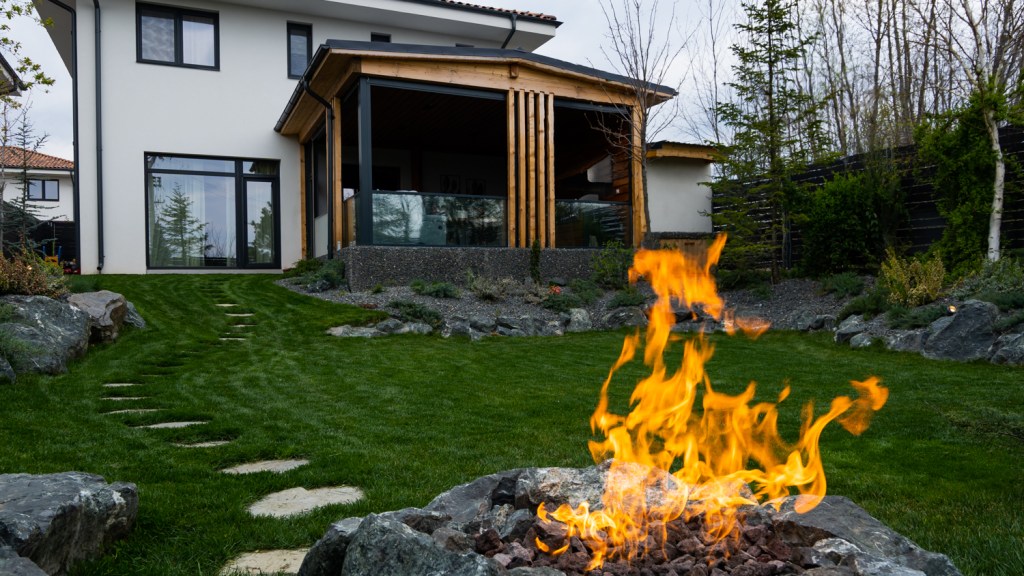 Următorul punct de atracție, după terasă, este locul de stat în jurul focului. Acesta funcționează pe gaz și este preferat de proprietari în serile târzii de vară, la un pahar de vorbă cu prietenii. Drumul către această zonă este ghidat de o alee formată din pași japonezi.