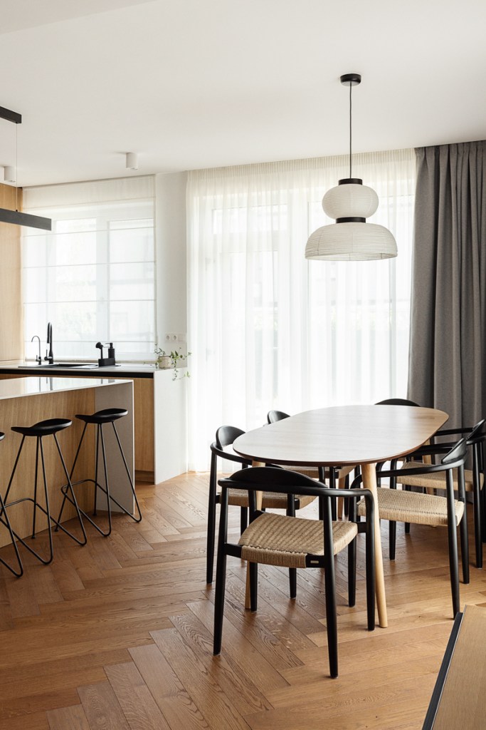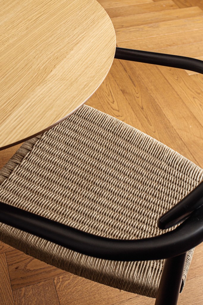 - În schemele cromatice cu culori neutre și materiale similare, care se repetă uniform în întreaga amenajare, integrați texturi variate (dar cu măsură) pentru a evita un aspect plictisitor. De exemplu, având canapeaua tapițată cu material boucle gri în living, nu am vrut să avem și scaunele de dining la fel, așa că am optat pentru o variantă cu cadru negru din lemn și șezut din frânghii împletite într-o nuanță caldă care se integrează bine cu lemnul folosit.