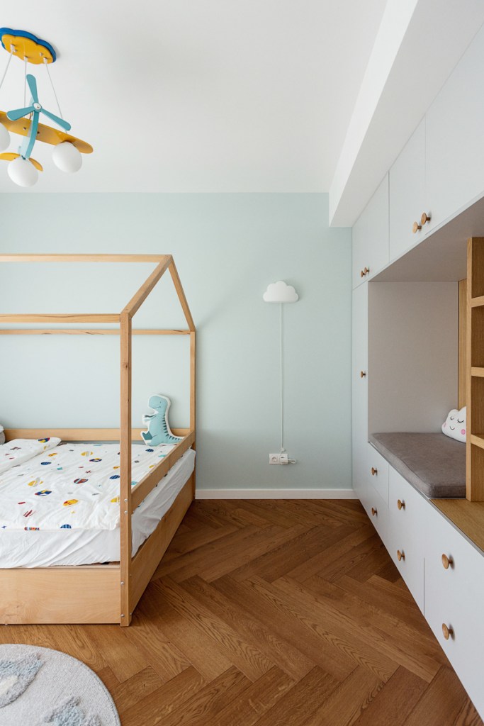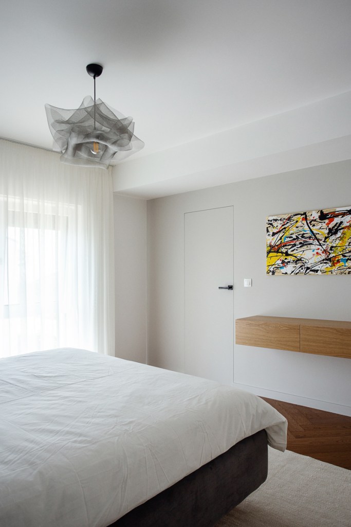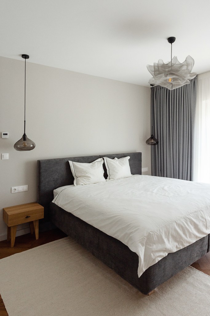 Resurse: Terrazzo-ul este achiziționat de la Osmyum. Blatul de bucătărie compozit Krion este de la Porcelanosa, iar parchetul stratificat este de la Vicla. Canapeaua a fost achiziționată de la Atelier September, iar pendulul de deasupra masei din dining este brandul &tradition (TheEdit.ro). Scaunele din dining și comoda pentru televizor sunt de la Kave Home. Lustra din dormitorul matrimonial este de la Dia Buga, iar tabloul din dormitorul matrimonial e o reproducere Pollock realizată de o artistă locală. Covorul din living este de la Zara Home, iar televizorul este Samsung The Frame.