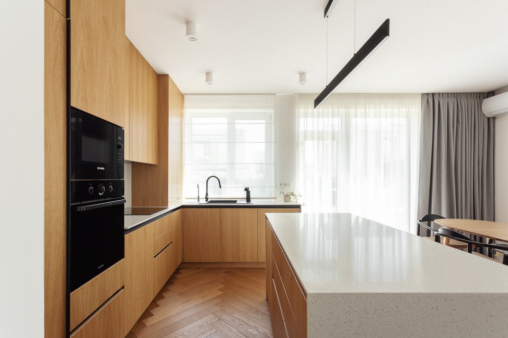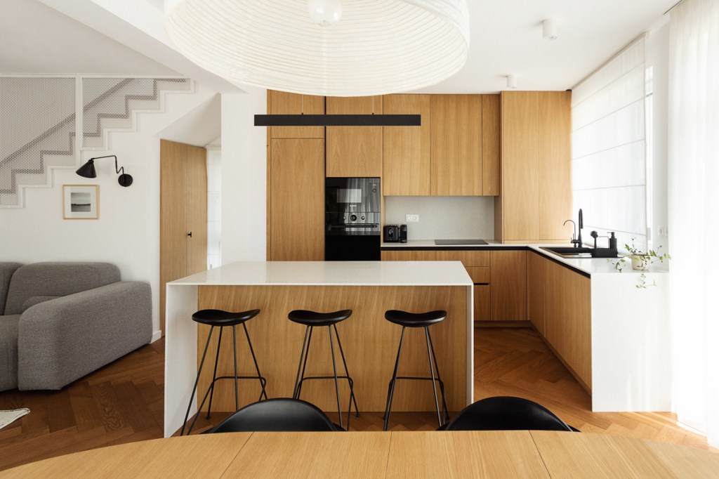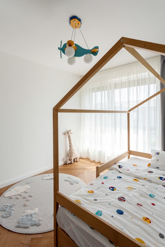 „Întreaga casă urmează aceeași linie estetică și cromatică: lemn, terrazzo, culori deschise, linii drepte, accente de negru pentru contrast. Mi-ar fi greu să definesc stilul amenajării. Aș zice că e modern, contemporan, cu ușoare influențe retro”, explică Andreea. „În ceea ce privește bugetul proiectului, partea de finisaje (parchet și terrazzo) și blatul de bucătărie au însemnat cea mai mare investiție (dar asta și datorită suprafețelor mari). Sunt însă elemente pe care, cel mai probabil, beneficiarii nu le vor schimba mulți ani de-acum încolo”.