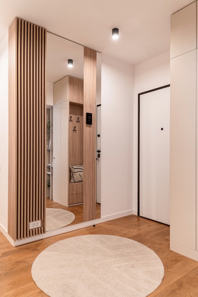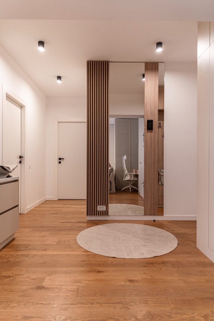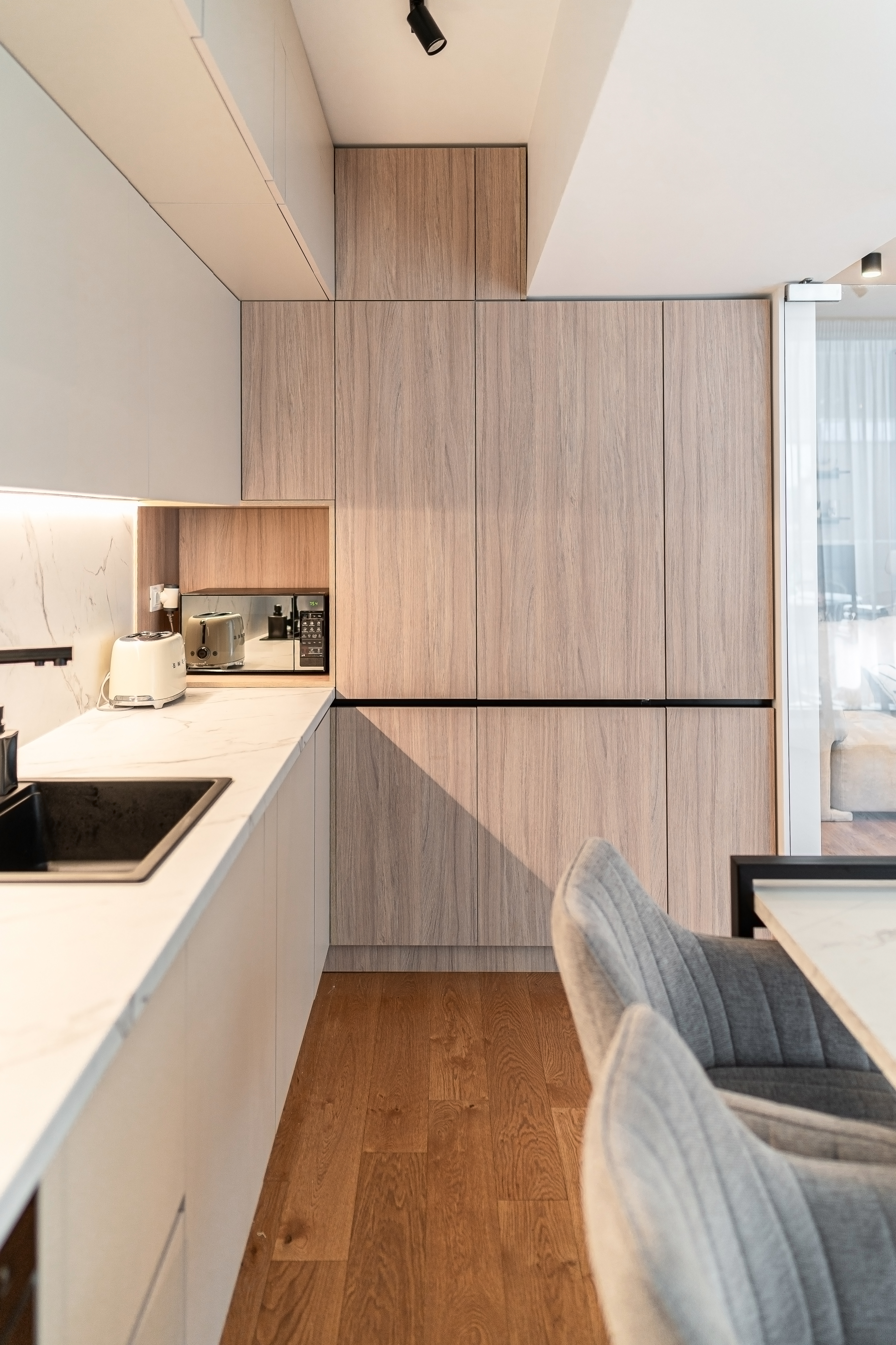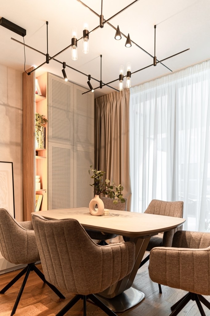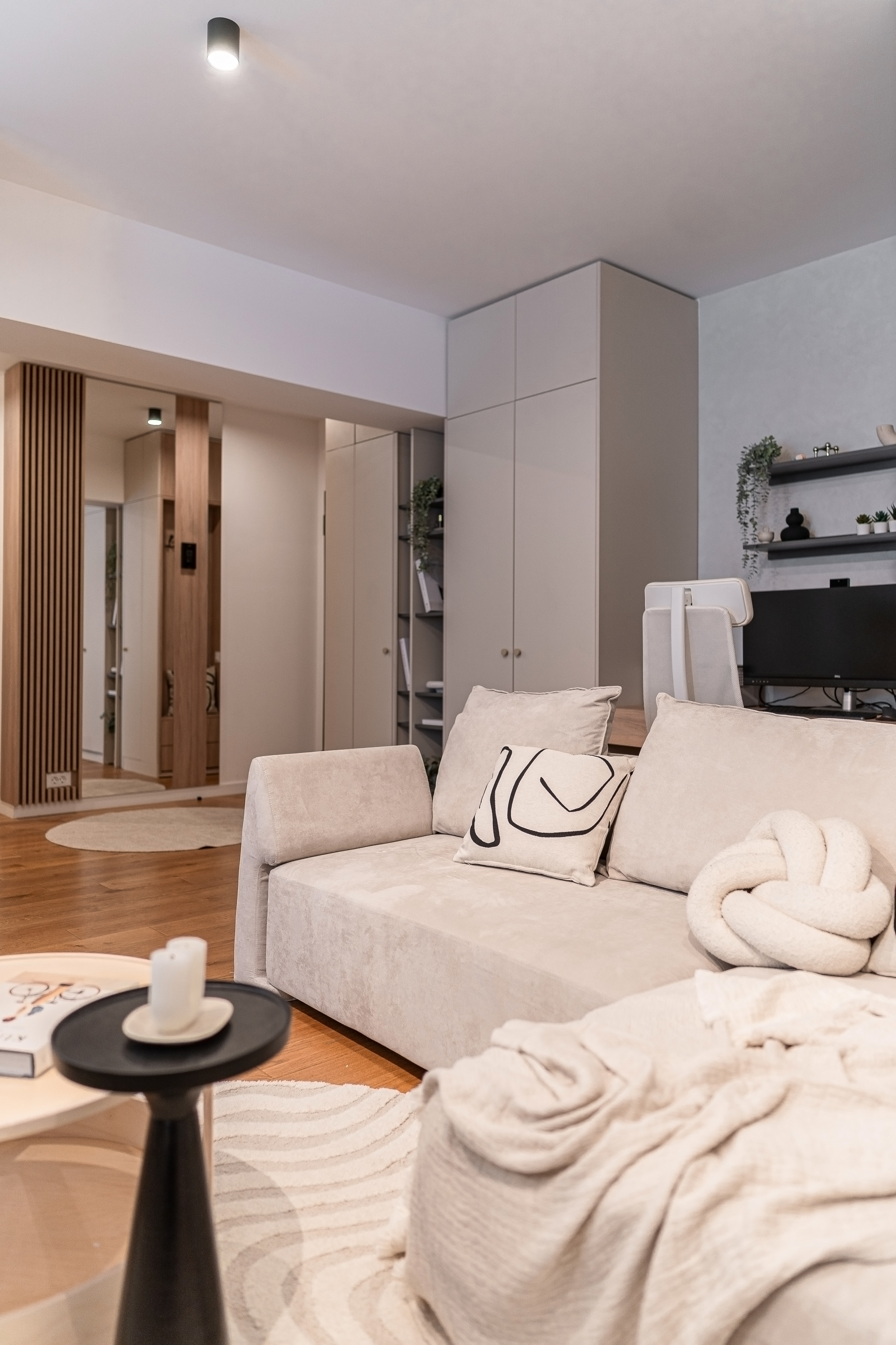„Funcționalitatea spațiului a contat foarte mult pentru beneficiari. Am gândit tot conceptul de amenajare în jurul acestui aspect”, spune Andreea. „Din punct de vedere estetic, am optat pentru culori neutre și lemn, într-o nuanță deschisă ca să obținem un interior cald și primitor. Apartamentul nu este foarte bine iluminat natural, din cauza unei clădiri de birouri care se află în fața blocului, așa că am fost nevoiți să găsim soluții care să ne ajute să corectăm acest neajuns”.