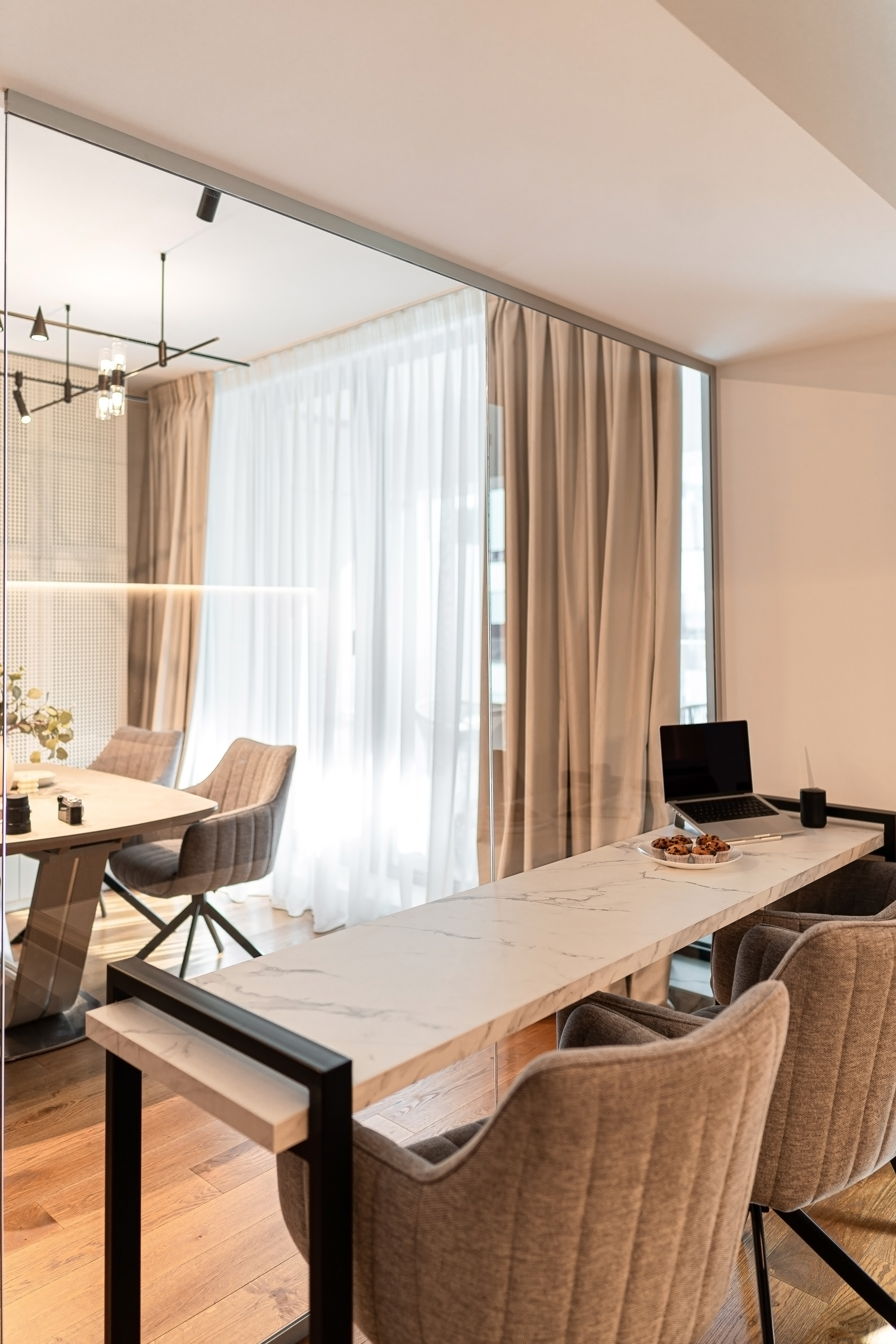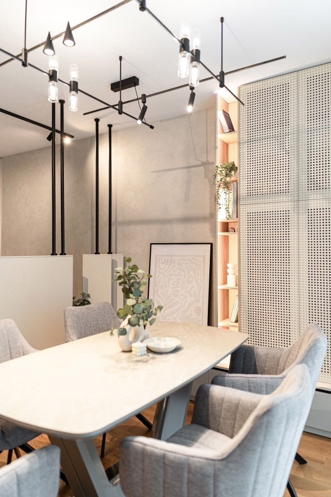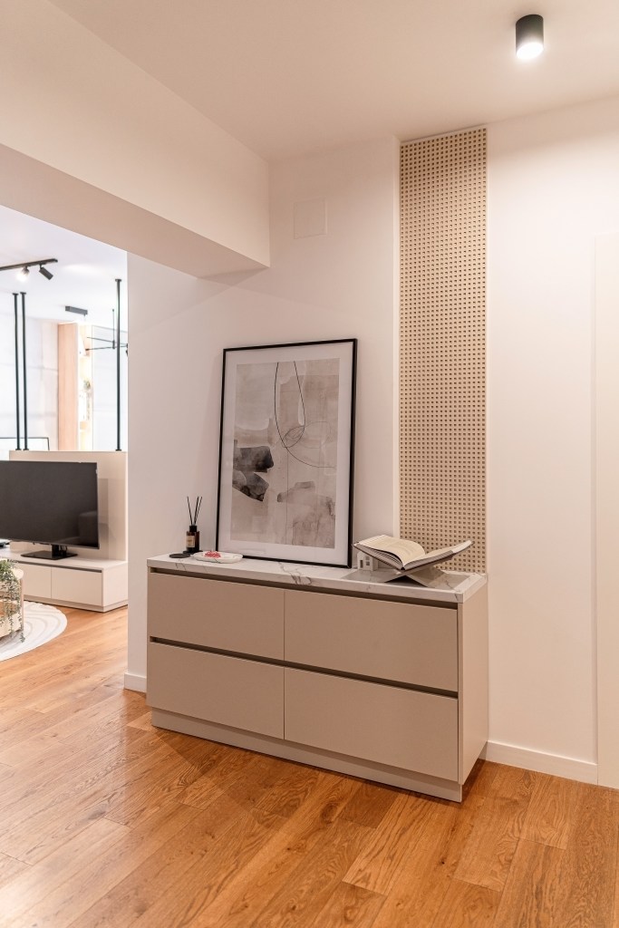 Un alt punct slab al apartamentului este compartimentarea interiorului. Încăperile sunt relativ mici și cu configurație atipică. Livingul, de exemplu, are o suprafață utilă de 28 de metri pătrați. Încăperea integrează zonă media, cu canapea modulară care se poate transforma în pat, dining cu masă extensibilă pentru opt persoane, birou și spațiu generos de depozitare. Important a fost ca aceste funcțiuni să coexiste armonios împreună și să nu sufoce amenajarea. Mobilierul personalizat a făcut ca fiecare centimetru disponibil să fie valorificat, din plin.