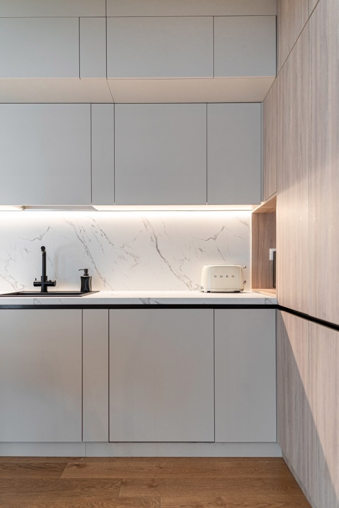 Andreea Petroiu și Alexandru Țîrcă, de la Intento Studio, au avut misiunea de a scoate maximum din cei 73 de metri pătrați utili. Proiectul a pornit de la ideea unui spațiu neutru, aerisit și funcțional, cu depozitări eficiente, integrate discret în decor. În planul inițial, apartamentul includea o zonă de zi cu bucătărie deschisă către living, dar pentru că beneficiarii obișnuiesc să gătească des acasă, Andreea și Alexandru au hotărât să o separe printr-un perete de sticlă.