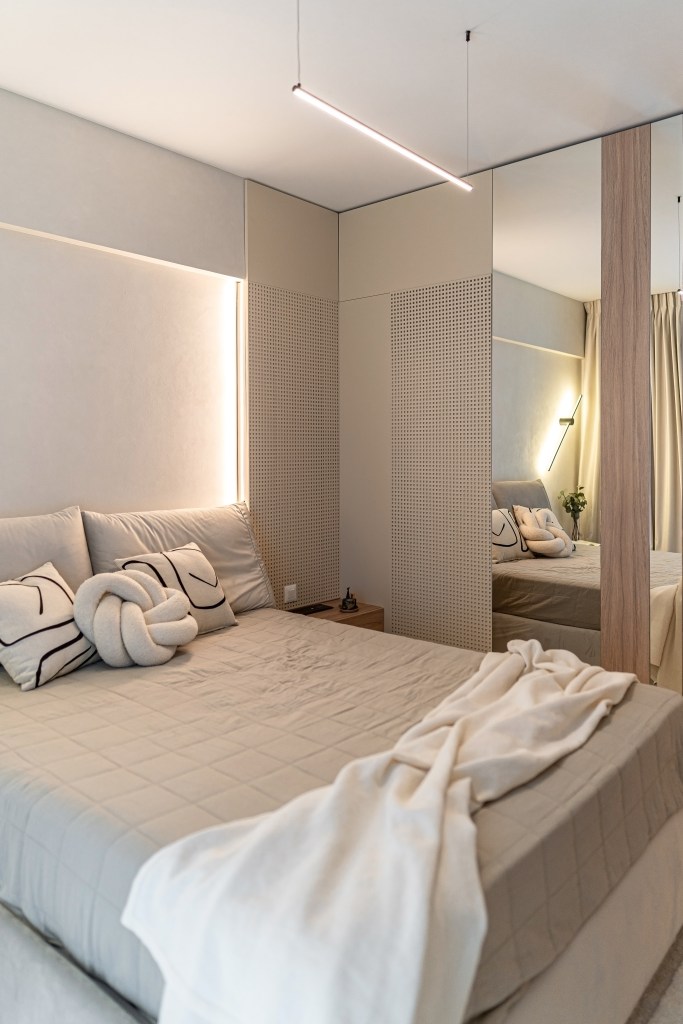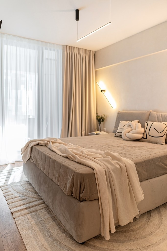 Dormitorul matrimonial este lung și îngust, configurație care a implicat o planificare atentă a mobilierului. Patul are o lățime de 160 de centimetri, pentru a face loc noptierelor și dressingului și pentru a păstra cât mai confortabile spațiile de trecere. Practic, încăperea este împărțită în două, pe lungime, integrând zona de dormit și zona de depozitare, delimitarea fiind făcută cu ajutorul mobilierului custom made. Paleta cromatică și stilul de amenajare din dormitorul matrimonial continuă tematica generală a proiectului.