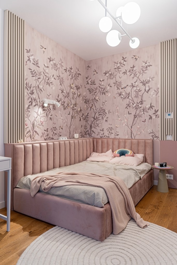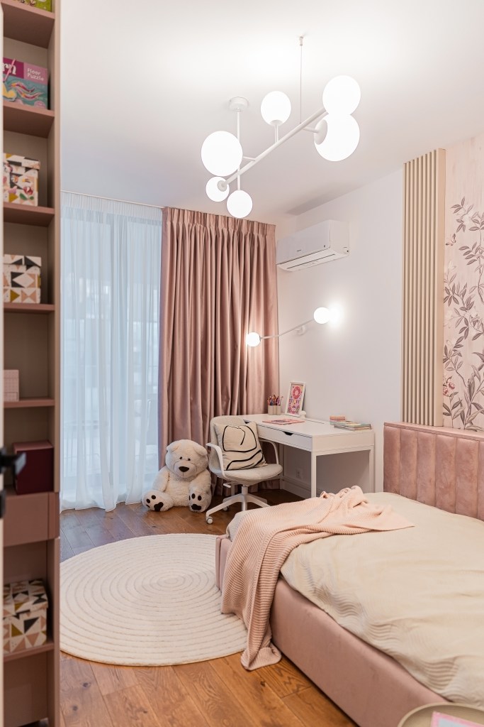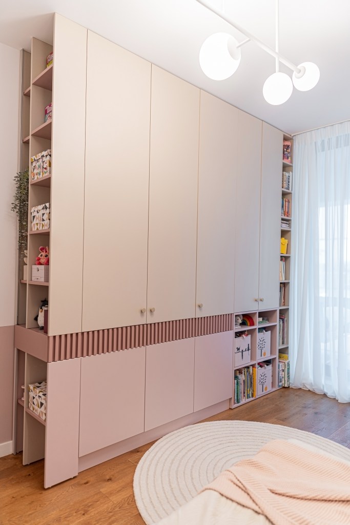 Și în camera fetiței, Andreea și Alexandru au avut grijă să optimizeze spațiul disponibil, proiectând un mobilier practic și modular, cu dulapuri generoase și sertare care să mențină totul ordonat. Decorul și culorile se schimbă puțin față de restul locuinței, dar se păstrează cromatica neutră și accentele de lemn.