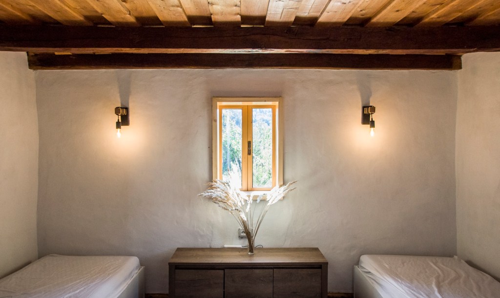 A reușit să amenajeze și cele două camere, unde a îmbinat elemente restaurate, cum ar fi tablourile vechi, cu cele moderne, cum ar fi un pat suprapus (făcut cu ajutorul unor meșteri locali) care se potrivește cu atmosfera de la interior, după cum susține.
