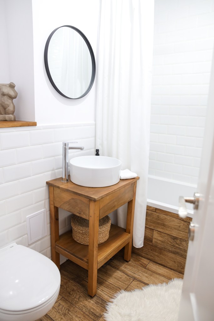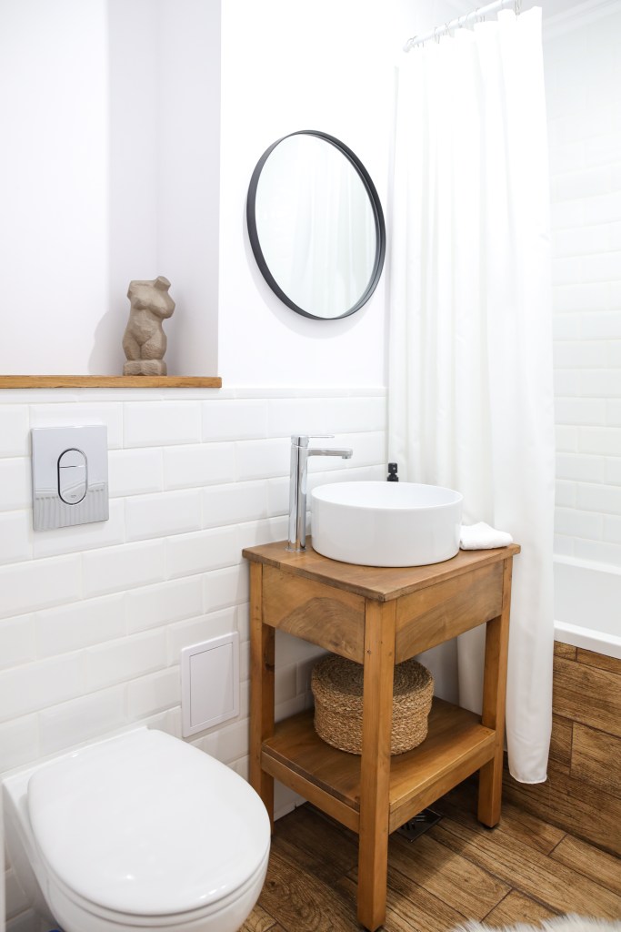 Cu o suprafață de doar 3,39 metri pătrați, baia a fost una dintre cele mai mari provocări ale proiectului. „A fost o provocare să îi oferim și funcționalitate și fluiditate,” spune Andreea. Mobilierul personalizat, finisajele neutre și atenția la proporții fac ca spațiul să pară mai aerisit decât dimensiunile reale.