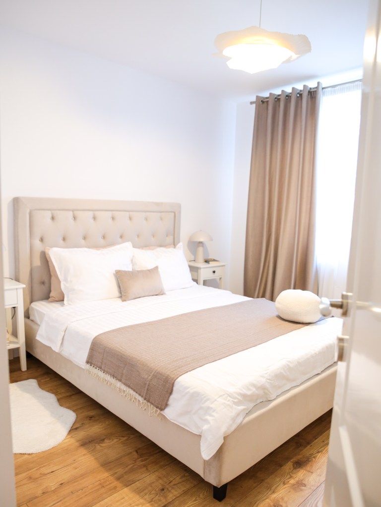 Mobilierul a fost ales pentru a păstra fluiditatea vizuală, iar spațiile de depozitare au fost gândite inteligent. „Pentru a evita încărcarea camerelor, am creat dressingul în zona debaralei. Un alt lucru de care am ținut cont a fost să realizăm unde s-a putut mobilier cât mai înalt, pentru a beneficia de toate spațiile și a da sentimentul de înălțime camerelor,” explică Andreea.