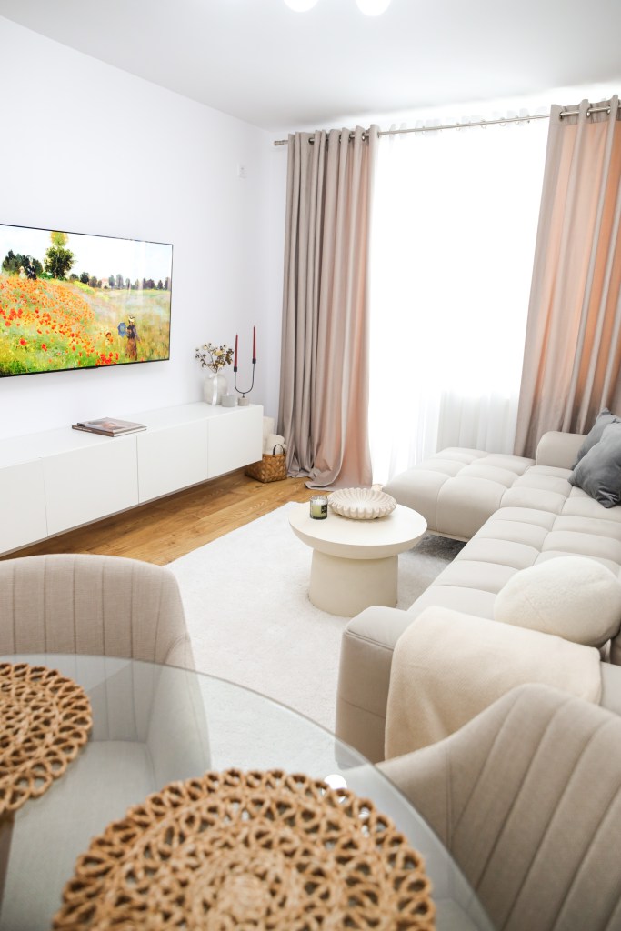 Amenajarea a fost inspirată de echilibrul stilului Japandi – o combinație între minimalismul japonez și confortul scandinav. I-au atras liniile curate și materialele naturale. Nu își doreau un spațiu încărcat, ci unul funcțional și cald. Lemnul deschis, nuanțele neutre și plantele verzi creează o atmosferă relaxantă, accentuată de lumina naturală care pătrunde pe tot parcursul zilei.
