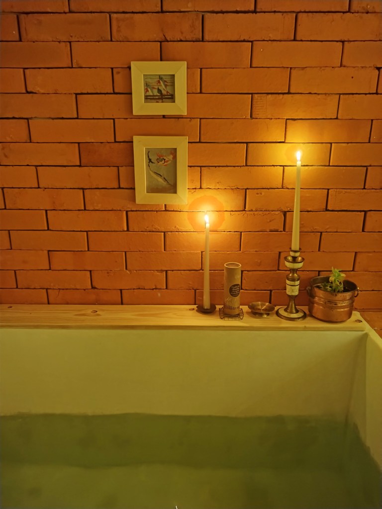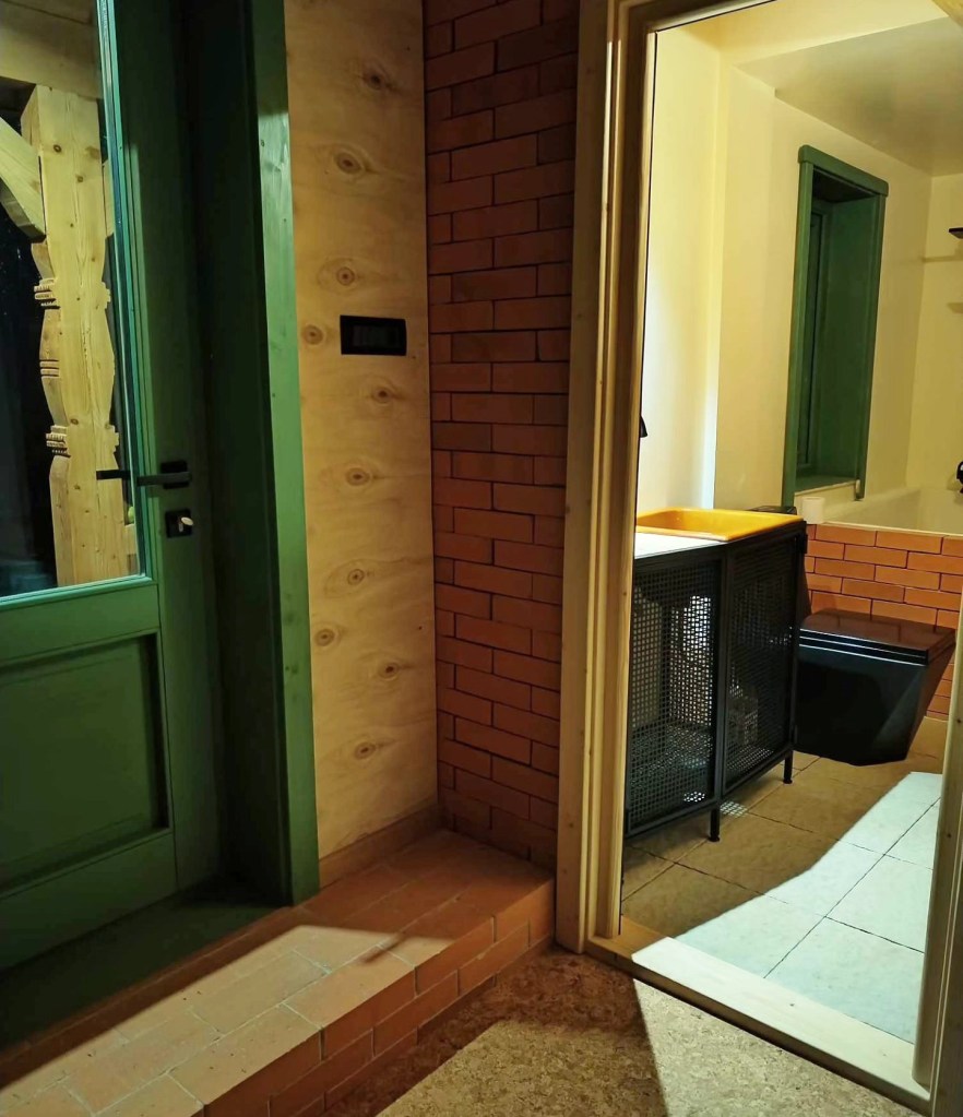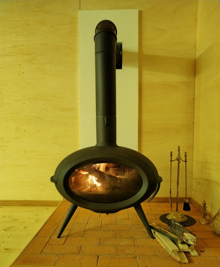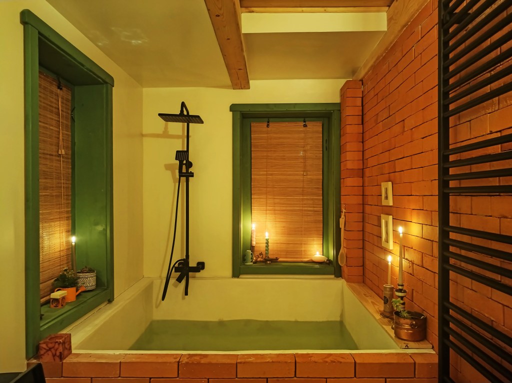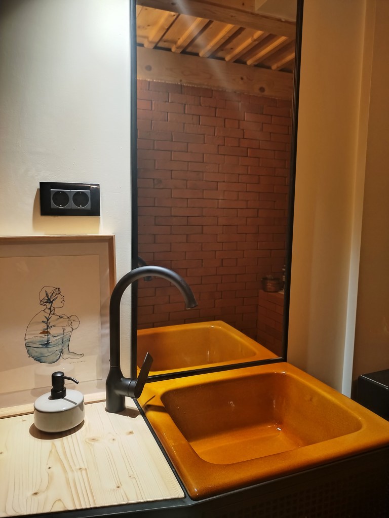 „Tot interiorul locuinței este pe gustul nostru, foarte aparte. Am putea să punem pe primul loc zona cu soba în forma unui ochi sau elipsoid, mai ales dacă te uiți cum arde focul de pe canapeaua foarte confortabilă, produsă la noi în țară”, spune Lucian. „Baia este de asemenea specială, cu toate finisajele ei sofisticate (tadelakt, chiuveta găsită în târgul de vechituri). Ne place faptul că din exterior casa pare veche, dar toate materialele folosite sunt noi, păstrând aspectul care te duce cu gândul la trecut. Iar interiorul are un design curat, aerisit, cu mici accente și detalii personalizate, cu texturi naturale și lumină caldă”.